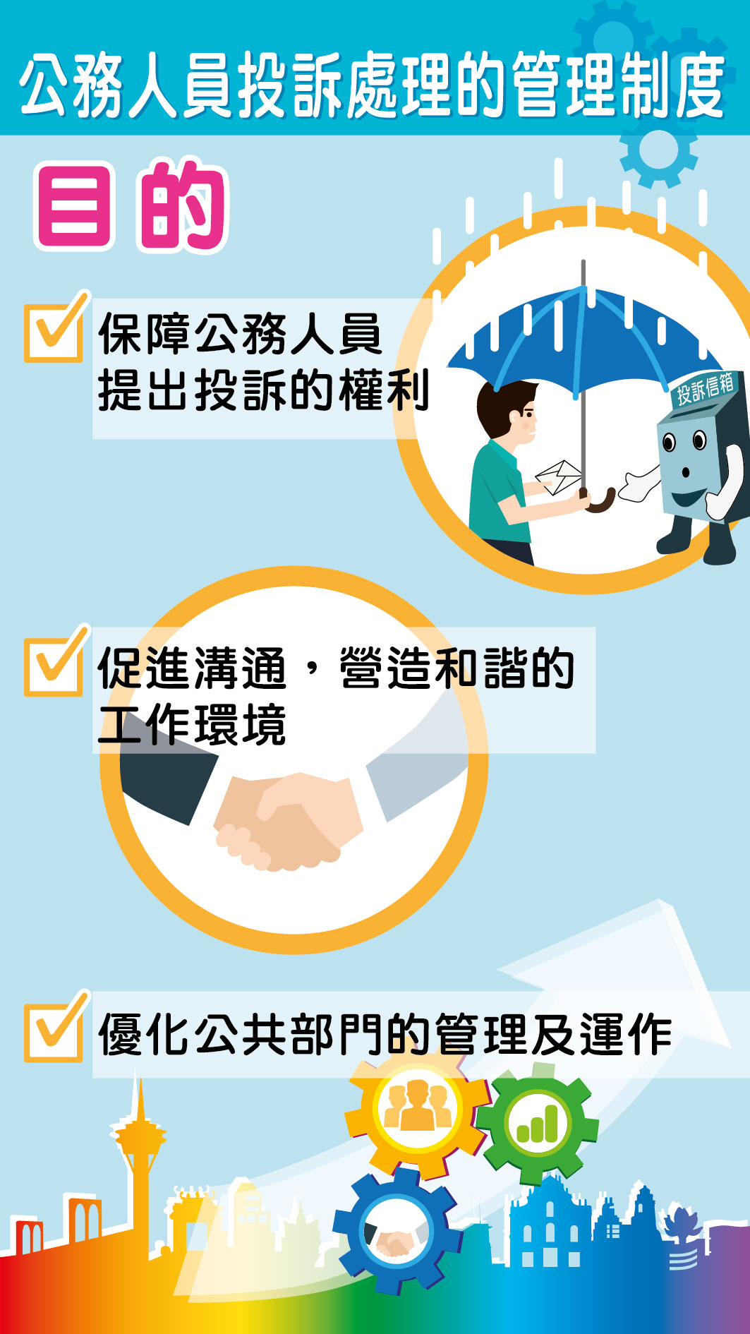 特區政府推行《公務人員投訴處理的管理制度》,目的是貫徹人性化管理理念,協助公共部門有效處理上下級和員工之間遇到的衝突和矛盾,持續完善公務人員的管理及內部運作。
