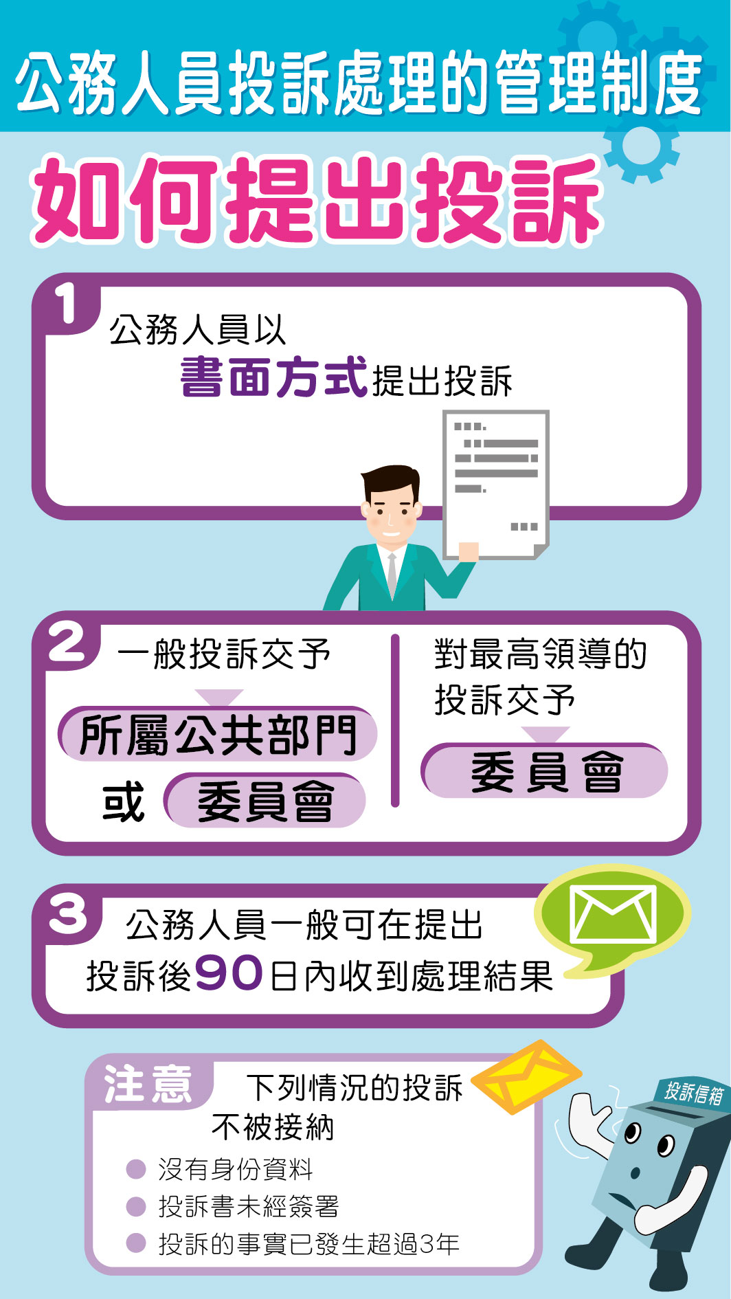 “投訴制度”規定,公共部門須與“委員會”合作,從副局長或等同職位的據位人中指定處理投訴的負責人。如工作人員不滿意公共部門處理其投訴的結果,可要求“委員會”介入協調。