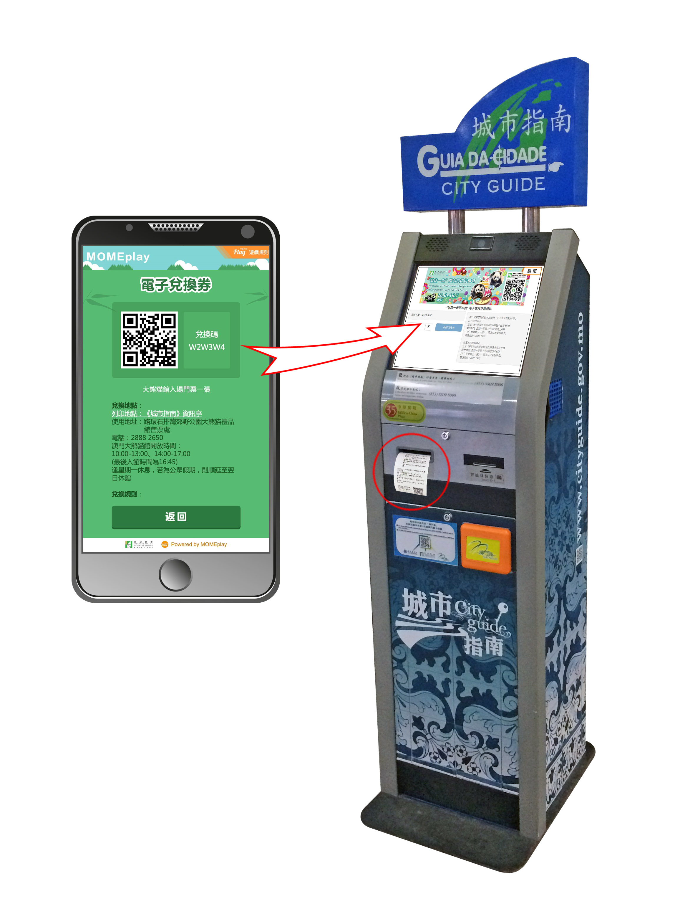 參加遊戲幸運中獎者,手機會出現中獎提示或電子使用券編碼,幸運兒須按兌換規則領取獎品。若獲得大獎金幣之幸運兒,須親臨民署綜合服務中心或北區市民服務中心憑手機顯示之電子禮券登記領獎,領獎日期將由專人通知,得獎人須親臨領獎;而獲得閃付卡及其他紀念品之中獎者,請先致電2847 1366進行查詢及登記,並須自行前往上述服務中心換領,出示並開啟手機程式然後輸入兌換碼換取有關禮品;獲得澳門大熊貓館門票,須透過全澳三十五台城市指南資訊亭輸入兌換碼並列印使用券,憑使用券可於大熊貓館售票處換領正式門票入場。