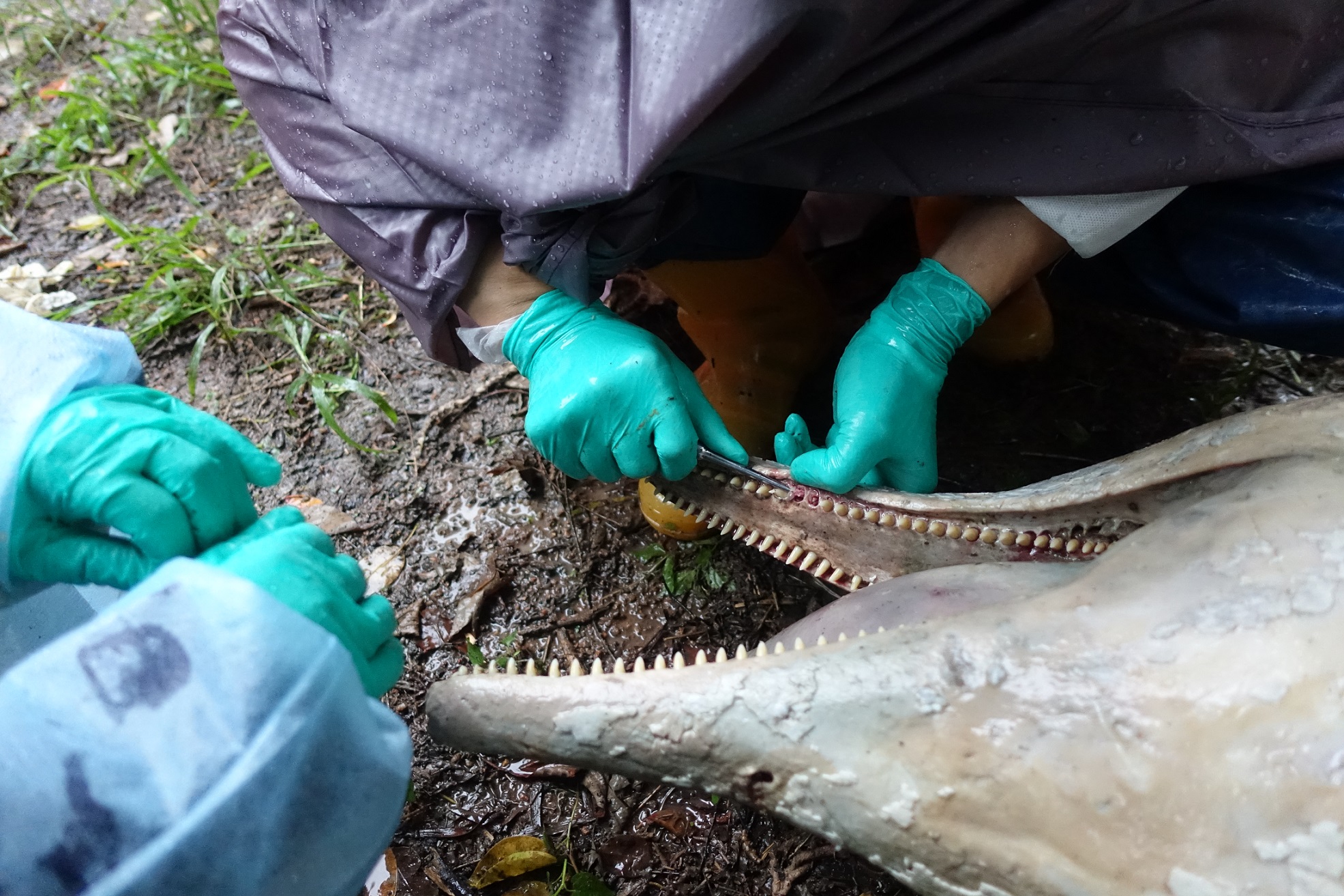 民署人員與中山大學海洋學院專業人員為海豚解剖和取樣,以作毒理學分析。從海豚的左側腹部觀察到瘀傷,解剖後發現有皮下出血,而尾部切口平整,推斷為利器切割。至於具體死亡原因,仍須待進一步分析化驗才能確實。
