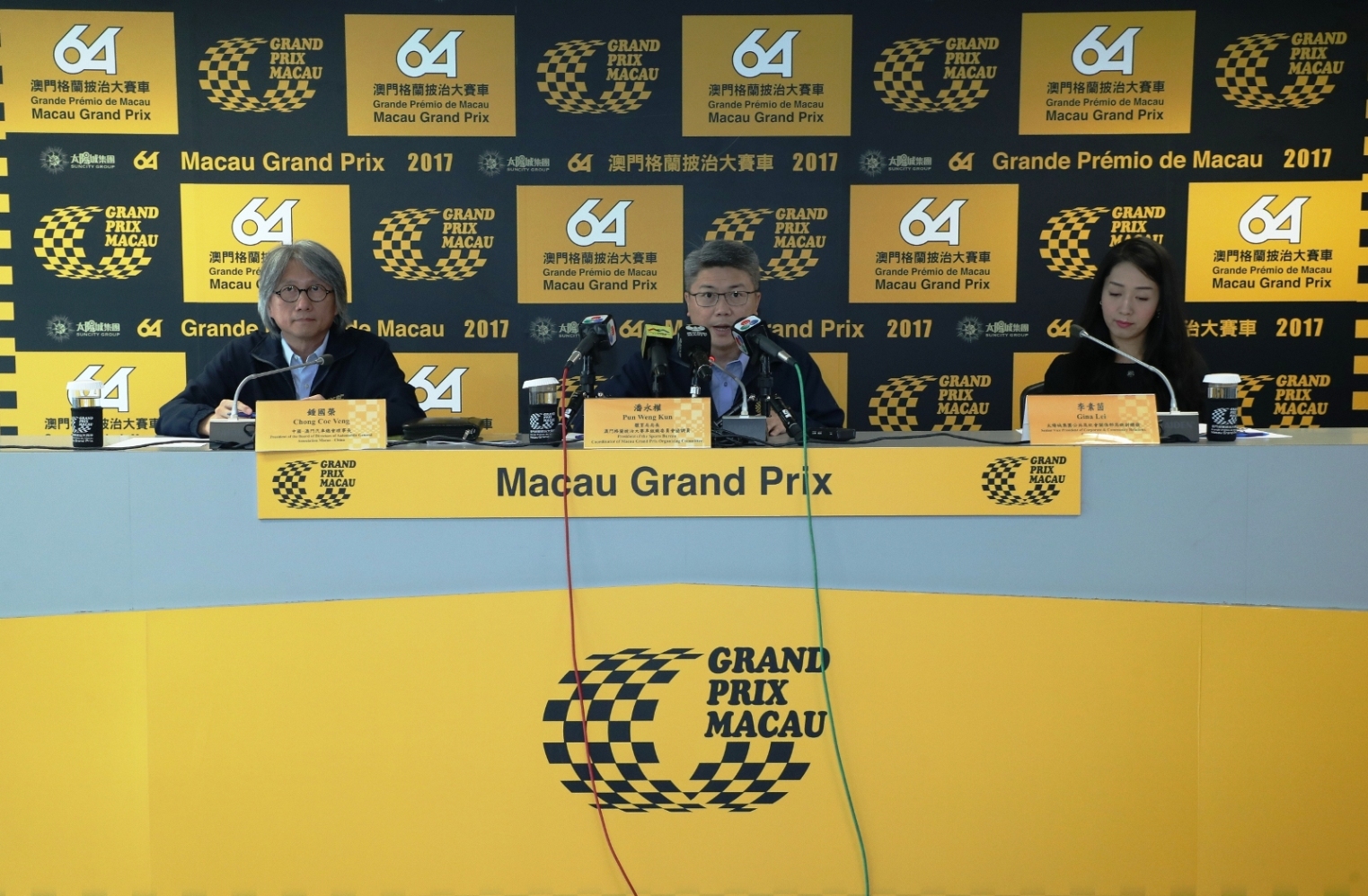 澳門特別行政區政府體育局局長及澳門格蘭披治大賽車組織委員會協調員潘永權、中國-澳門汽車總會理事長鍾國榮、冠名贊助商太陽城集團公共及社會關係部高級副總裁李素茵等出席新聞發佈會,會見傳媒。