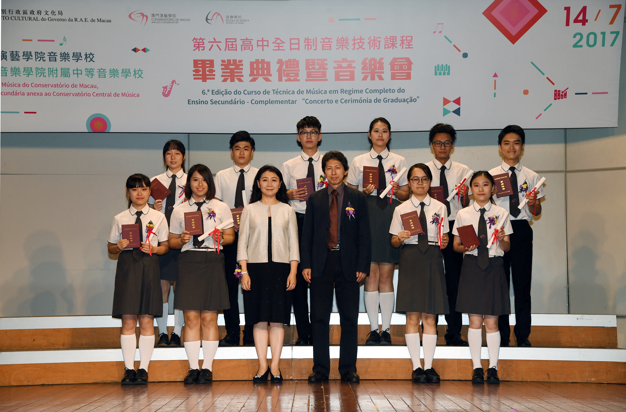 文化局澳門演藝學院音樂學校日前於崗頂劇院分別舉行第六屆全日制音樂技術課程《畢業典禮暨音樂會》、《友 ∙ 樂》夏日音樂會二零一七,以及二零一六至二零一七學年普及課程結業典禮暨優秀學生音樂會。各項系列活動均得到市民及社會各界人士蒞臨支持。