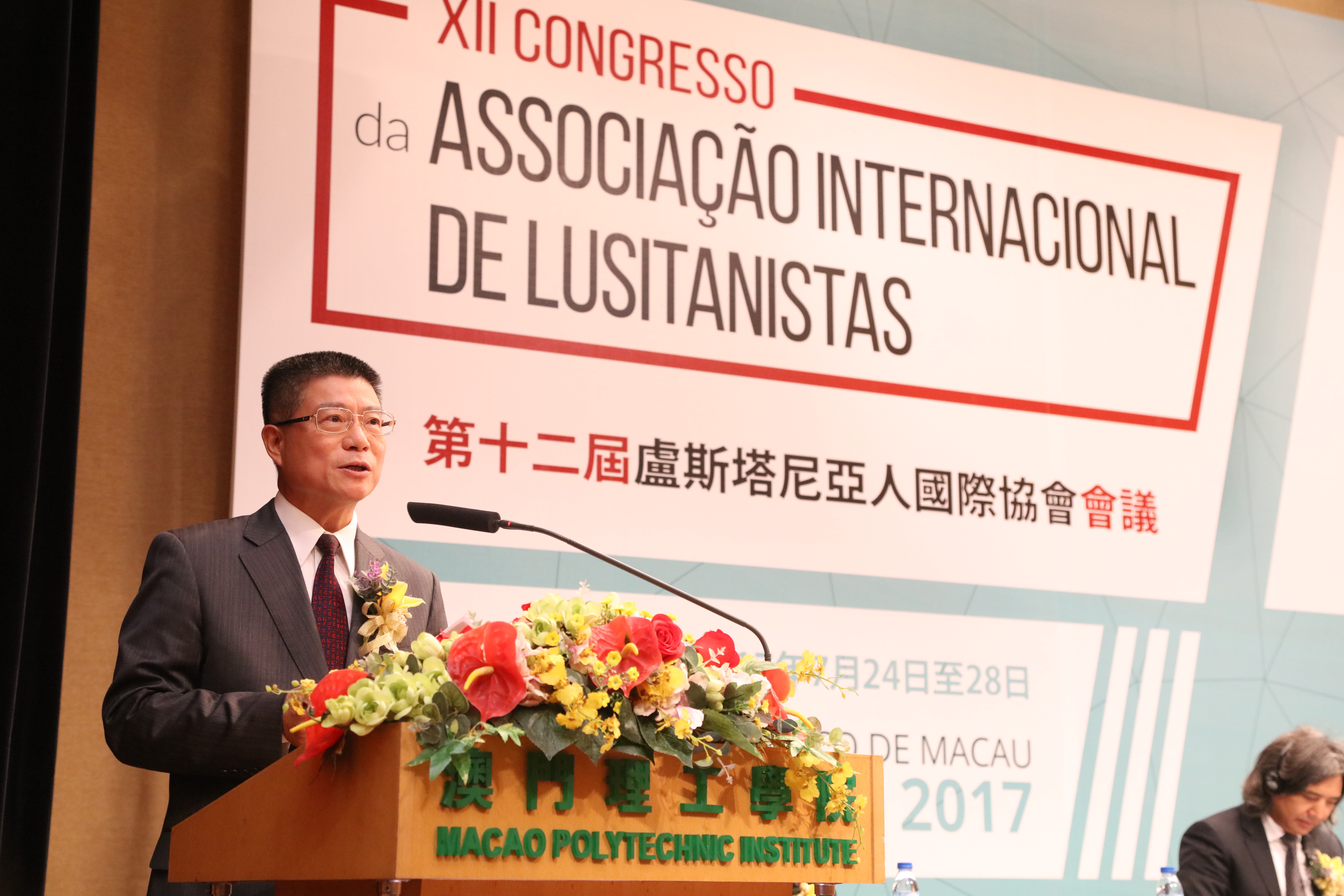 李向玉致辭時表示,盧濟塔尼亞人國際協會第十二屆大會不僅是一個學術性的大會,也是葡語和葡語國家文化界的一次盛大聚會。他感謝大會選擇在澳門,在澳門理工學院舉行。同時感謝盧濟塔尼亞人國際協會榮譽委員會的全體成員,以及所有對本次大會贊助單位澳門基金會、葡萄牙古本江基金會、葡萄牙賈梅士學會、高等教育輔助辦公室,以及旅遊局的支持。李向玉表示,盧濟塔尼亞人國際協會大會今天歷史性地在澳門理工學院舉行,見證葡萄牙語一直是澳門發展戰略中的重要一環。理工在辦學過程中,傳承有一百多年歷史的中葡翻譯課程,並將其進一步發揚光大。同時借助葡語辦學的優勢,開辦葡語學士學位課程和中國與葡語國家經貿關係學士學位課程。今年,又為培養葡語教師,專門開辦了新的丶學士學位葡語課程。此外,積極與葡萄牙高等院校合作辦學當中,理工的學位課程、研究生課程及科研工作已日趨多樣化。李向玉強調,在澳門和中國內地同時開展葡語和葡語文化教學是理工學院戰略規劃的一部分,盧濟塔尼亞人國際協會第十二屆大會在理工學院舉行,這不僅與理工著眼於中國內地以及國際的戰略規劃不謀而合,同時也是因為葡語是發展的根基、辦學的根本。