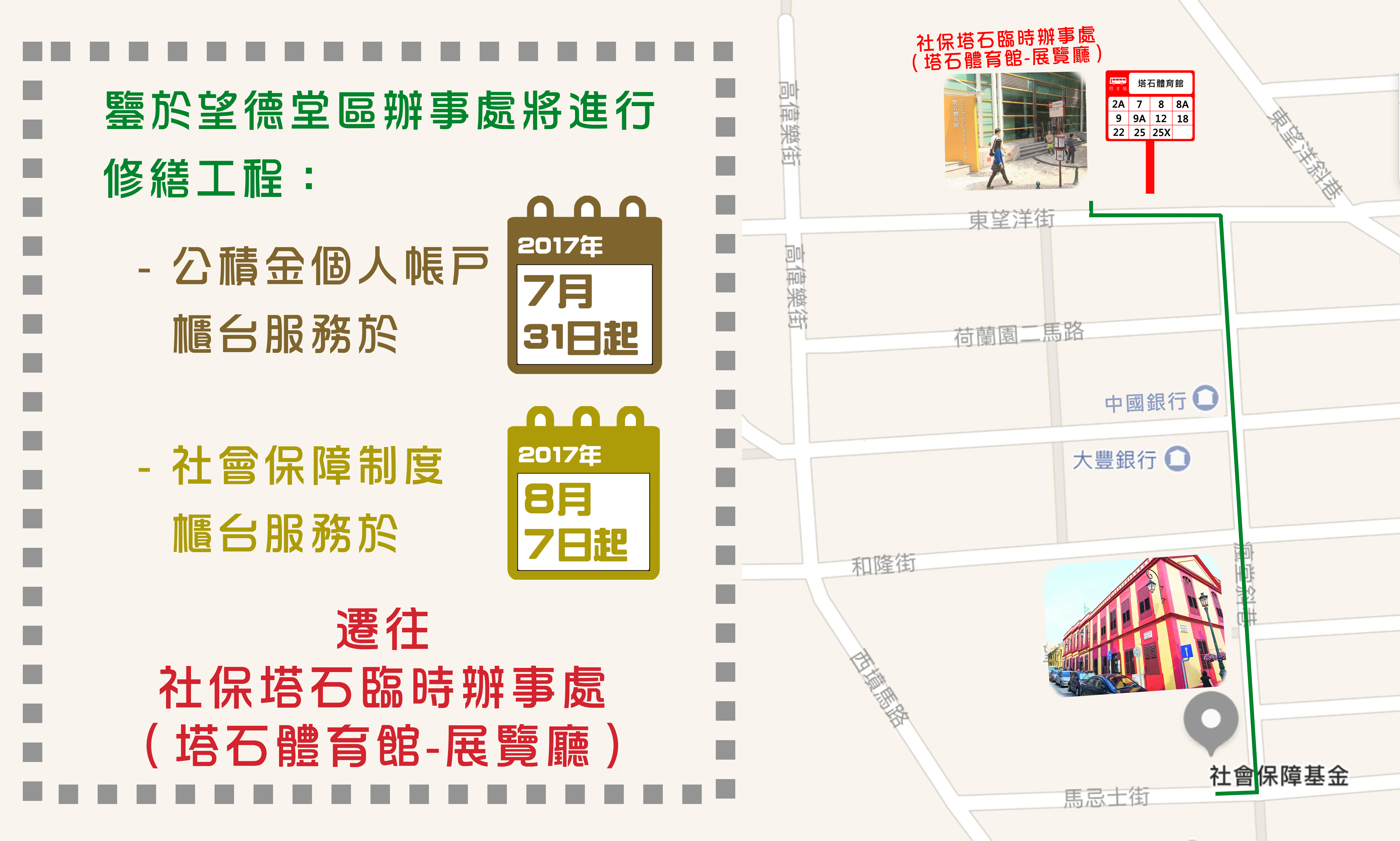 為配合修繕工程的展開,社會保障基金望德堂區辦事處於8月7日全面關閉,服務櫃台下周一起陸續遷至位於塔石體育館展覽廳的臨時辦事處,有意辦理社保服務的市民需留意服務櫃台的搬遷時間。