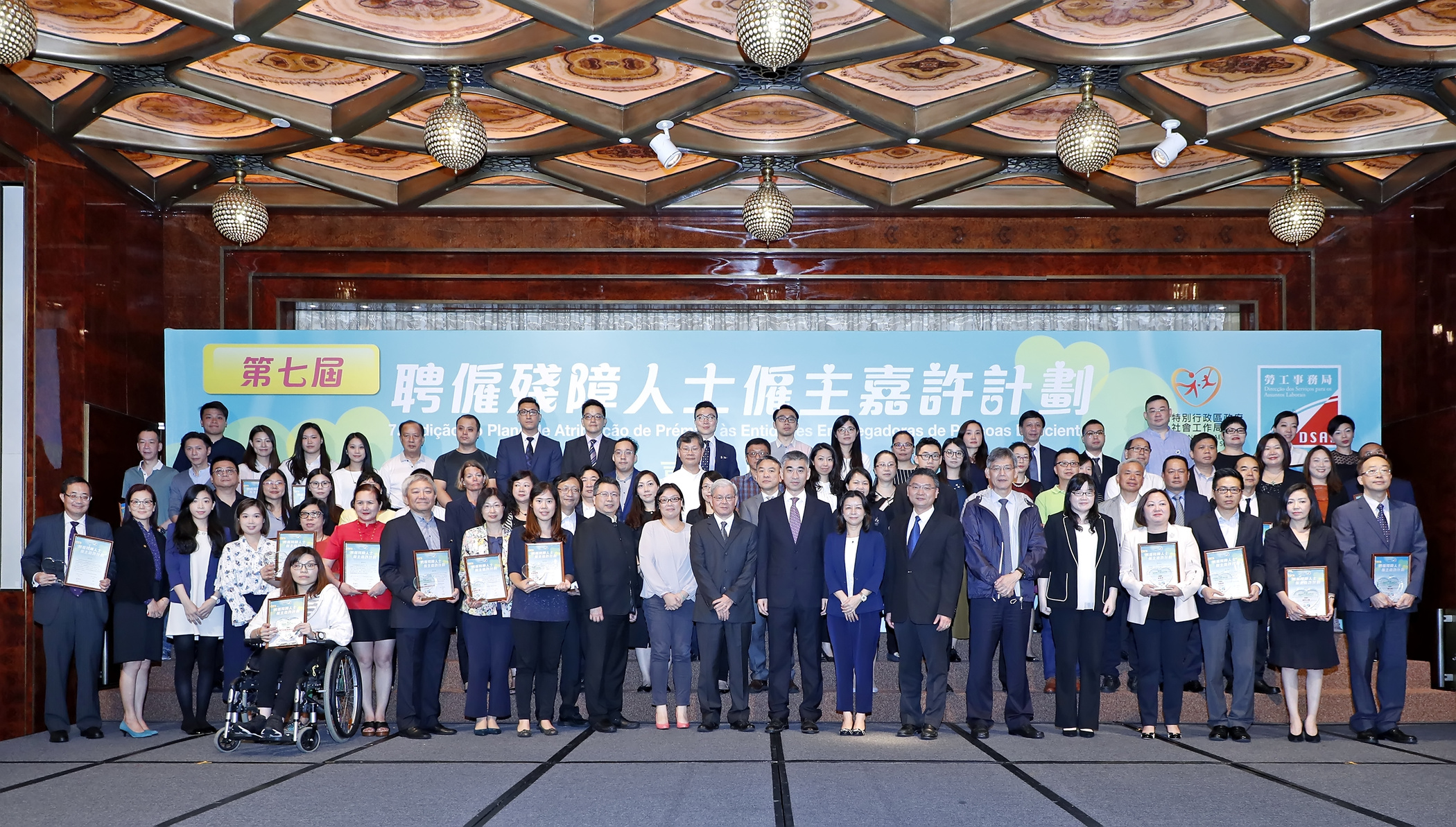 勞工事務局與社會工作局合辦「第七屆聘僱殘障人士僱主嘉許計劃」,7月26日中午假澳門美高梅大宴會廳舉行嘉許典禮,向本澳78間僱有殘障人士的商戶及機構作出公開嘉許。
