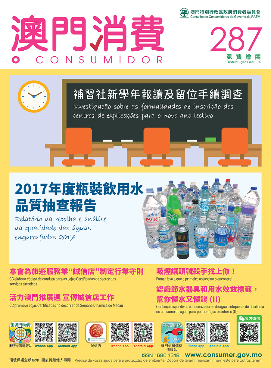 消委會與民政總署食品安全中心進行年度恆常合作,抽查30款瓶裝飲用水的品質,全部樣本符合檢測標準的要求,詳細資料載於新一期《澳門消費》。