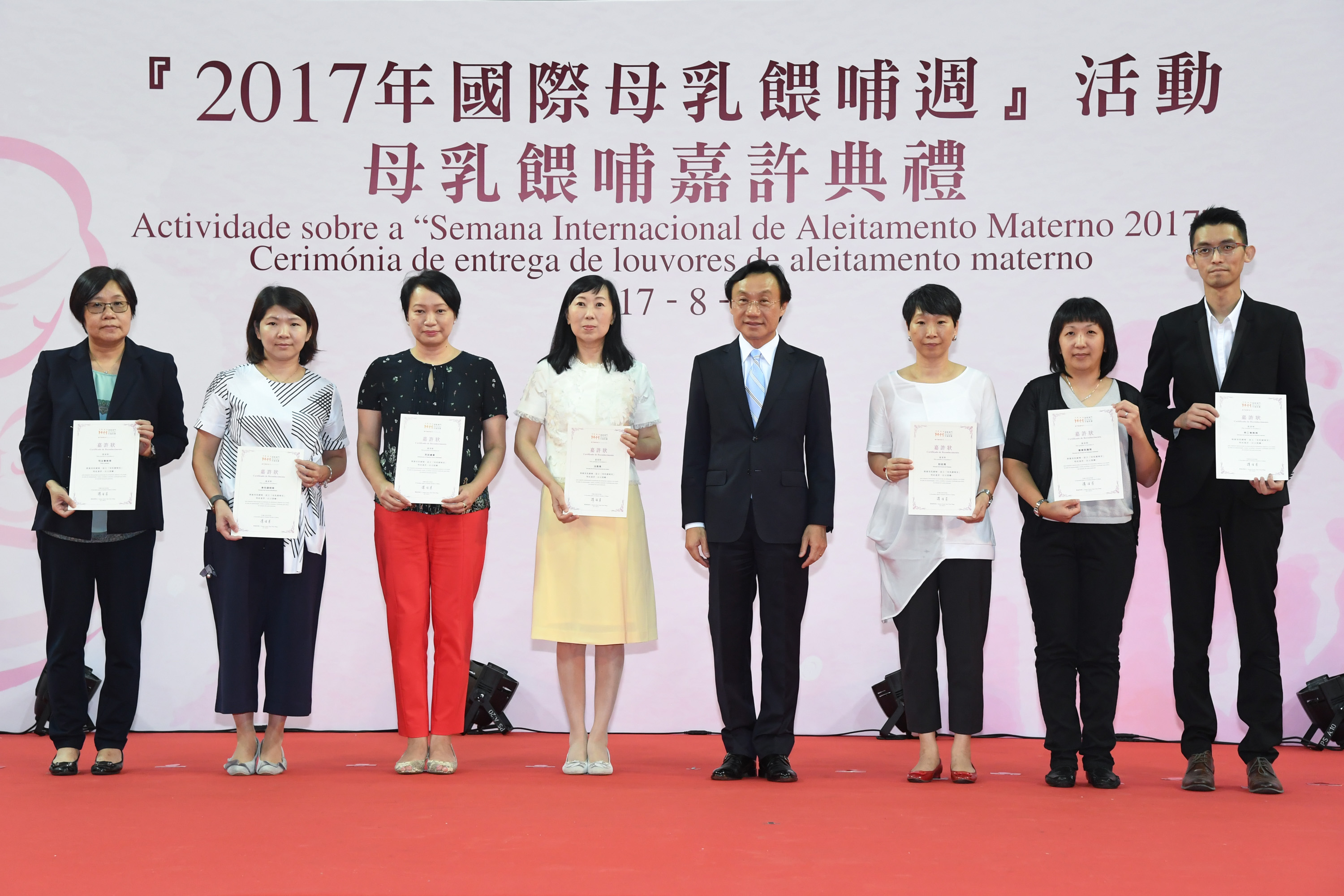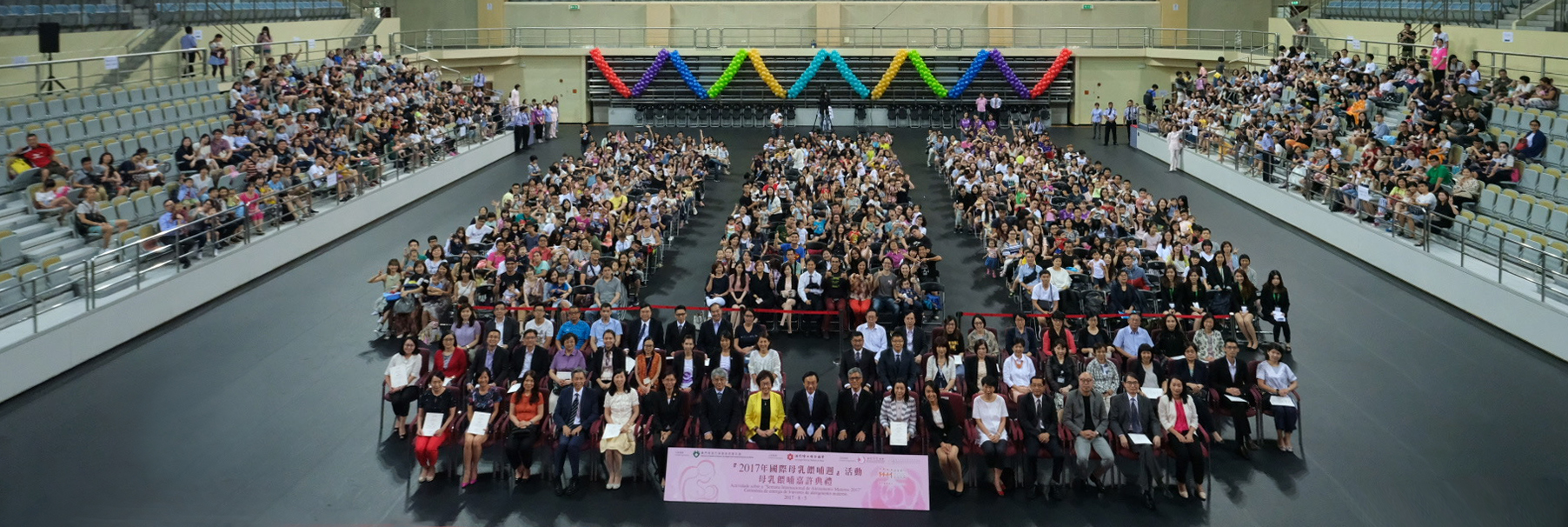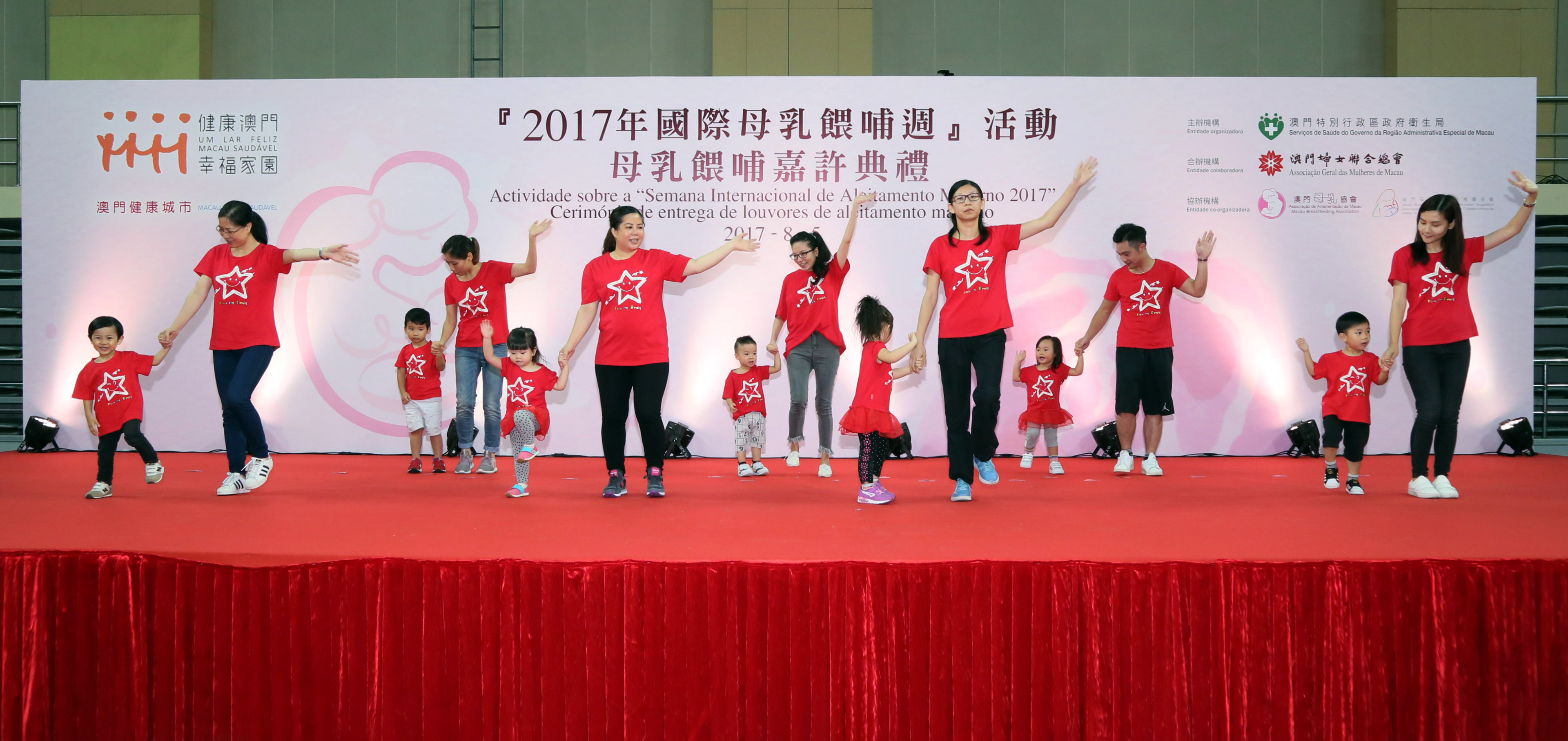 衛生局今日(8月5日)聯同澳門婦女聯合總會、澳門母乳協會及澳門育兒及母乳餵哺協會於塔石體育A館舉辦「2017國際母乳餵哺週-嘉許典禮」,希望透過政府帶動、社區支持、全民參與的方式建立和諧的哺育環境,促進社會對母乳餵哺的支持和關注。社會文化司譚俊榮司長帶領多個政府部門代表等出席了嘉許典禮,超過500多個家庭,約2000人參加了是次活動,場面溫馨熱鬧。