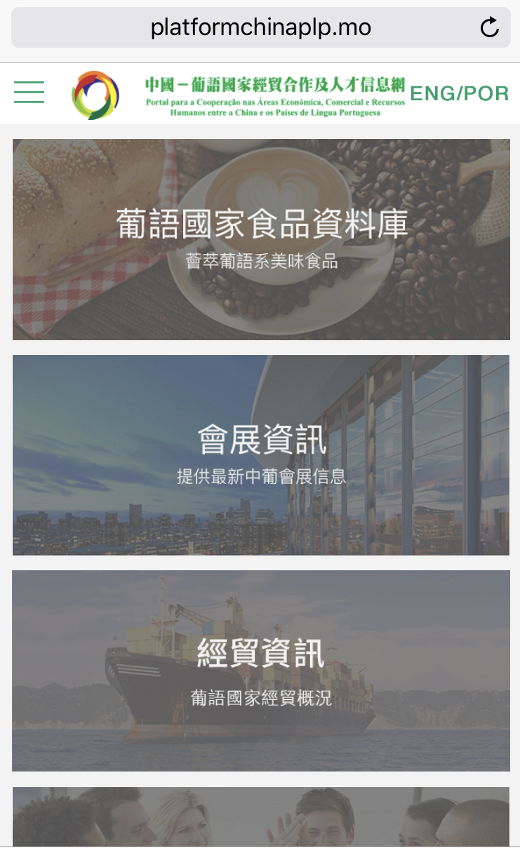 為發揮中國與葡語國家商貿合作服務平台作用,推動“三個中心”的建設並協助企業把握發展機遇,國家商務部、澳門特別行政區政府經濟財政司、澳門貿易投資促進局等多個部門及機構於2015年4月1日共同推出“中國─葡語國家經貿合作人才信息網”,該網站截至今年7月已吸引超過36萬瀏覽量,近日網站手機版已全面升級優化,如部分設有“B2C”標籤的葡語國家食品可以直接跳轉到第三方平台購買、協助客商轉交參展意向等,為客商提供更方便快捷的服務,拓展中葡無限商機。