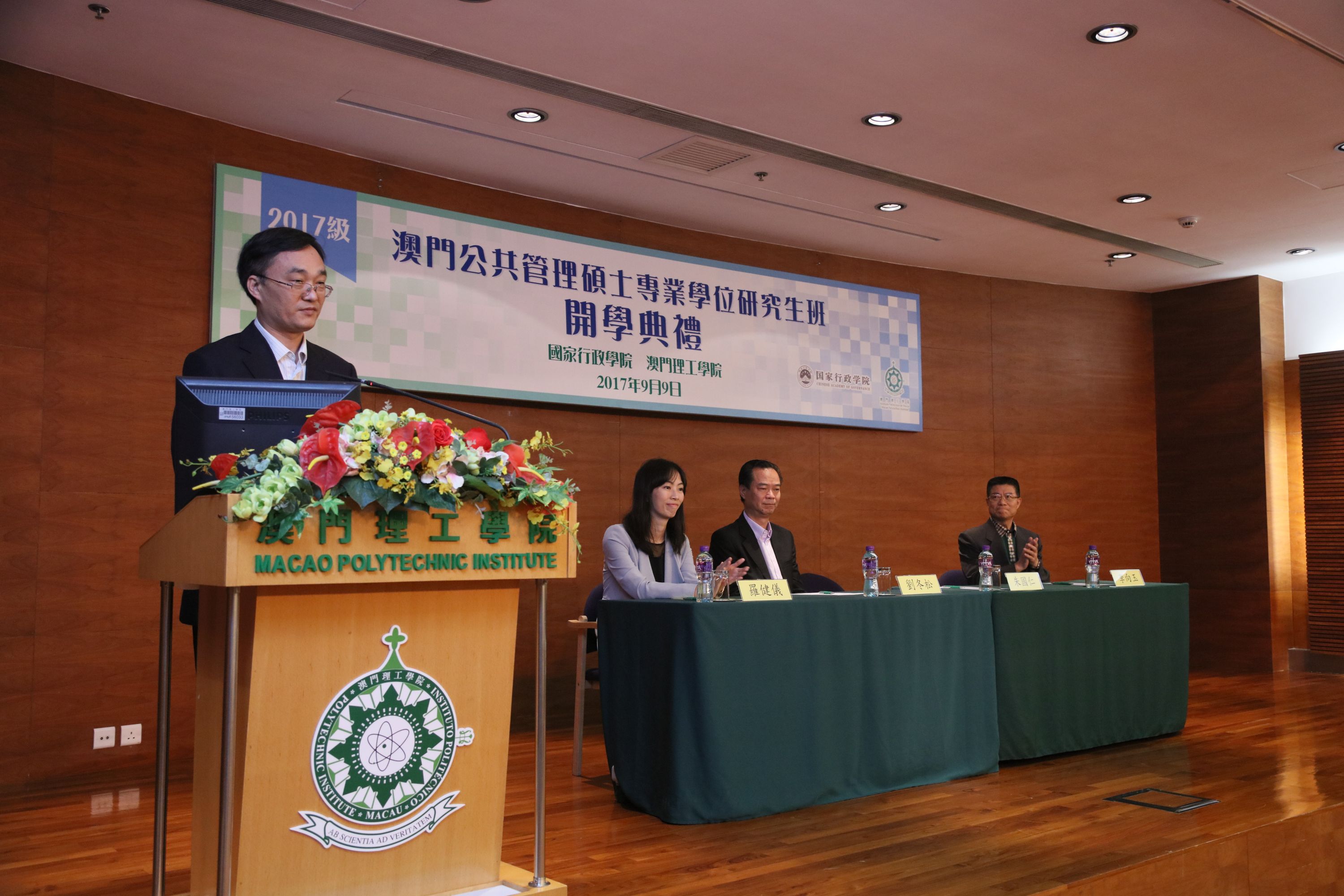 由國家行政學院與澳門理工學院合辦、澳門特別行政區政府行政公職局支持的2017級“公共管理碩士(MPA)專業學位研究生課程”開學典禮,9月9日上午十時在澳門理工學院舉行。國家行政學院研究生院朱國仁院長、中央人民政府駐澳門特別行政區聯絡辦公室培訓中心劉冬松副主任、澳門理工學院李向玉院長,以及澳門特別行政區政府行政公職局羅健儀副局長出席了開學禮。朱國仁院長、李向玉院長、羅健儀副局長等主禮嘉賓在致辭時勉勵同學努力學習、專注研究,成為公共管理的專才,為澳門特區貢獻力量。 “公共管理碩士(MPA)專業學位研究生課程”, 始於2009年, 旨在為澳門特別行政區培養具備公共管理理論和實踐經驗,掌握社會發展規律,且能依法落實行政工作的高層次、應用型管理人才。學生以非全日制在職方式學習,國家行政學院負責制定“MPA課程”的培養方案、編制教材、選派教師、課程考核和教學評估。澳門理工學院提供教學場地,課程管理,並負責教學支援及協助教學評估。完成培養方案規定內容,通過學位論文答辯者,可獲國家行政學院頒發公共管理碩士(MPA)專業學位研究生畢業證書和學位證書。課程已開辦八屆,累計入讀學生444人,其中306人已通過論文答辯,獲得碩士學位,本學年“公共管理碩士(MPA)專業學位研究生課程”獲錄取人數為40人。