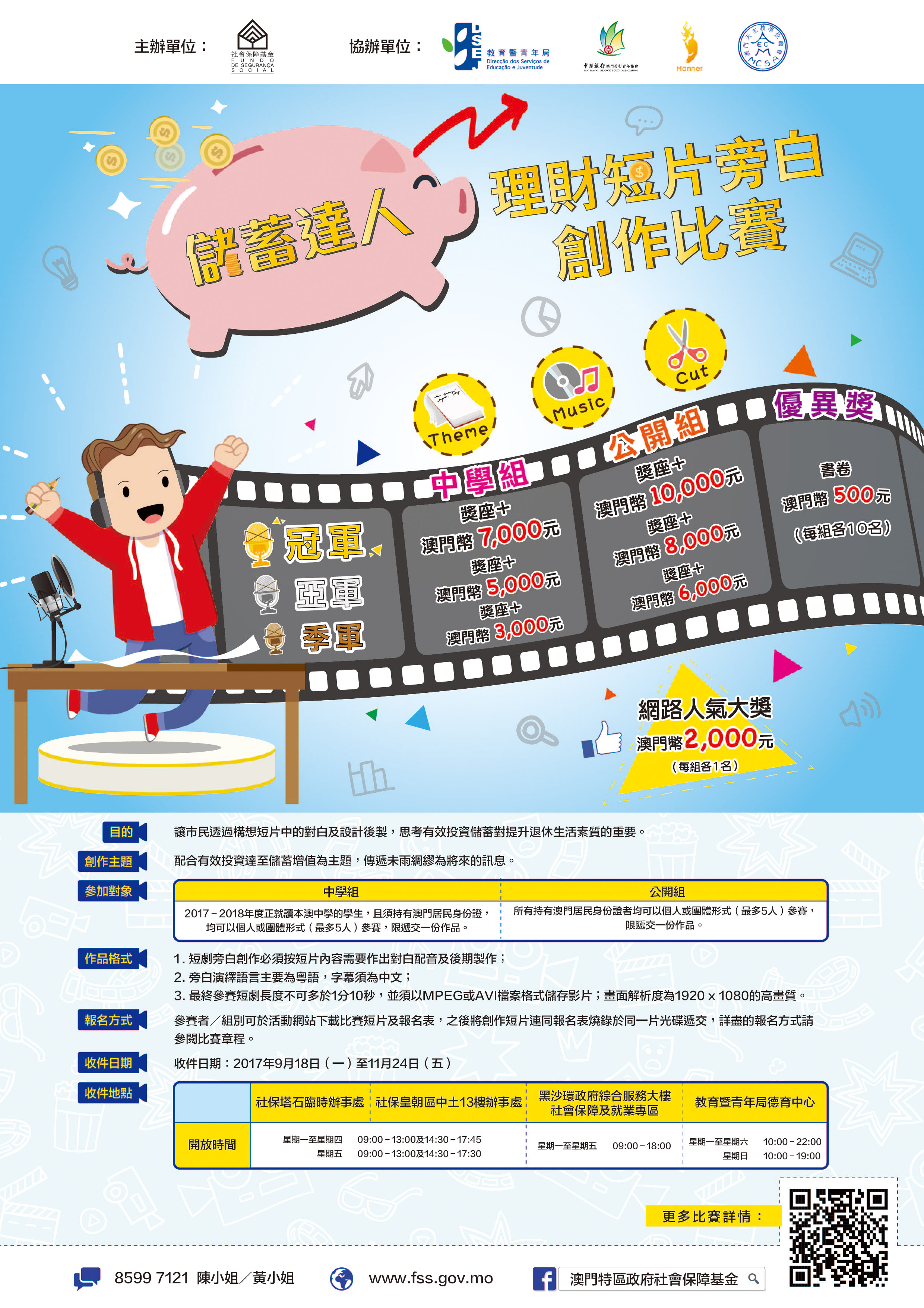參加者可登入社會保障基金網站www.fss.gov.mo詳閱比賽章程,下載比賽短片並配合主題加入粵語旁白配音及後期製作,於11月24日或之前將作品連同報名表遞交至社保基金各服務點或教青局德育中心。