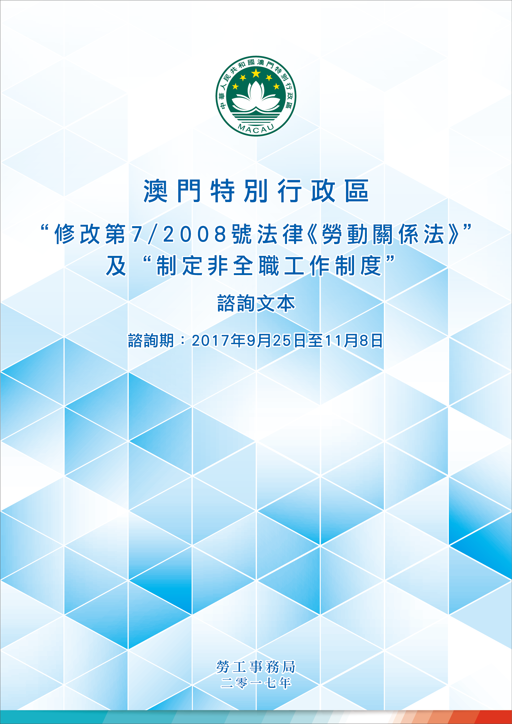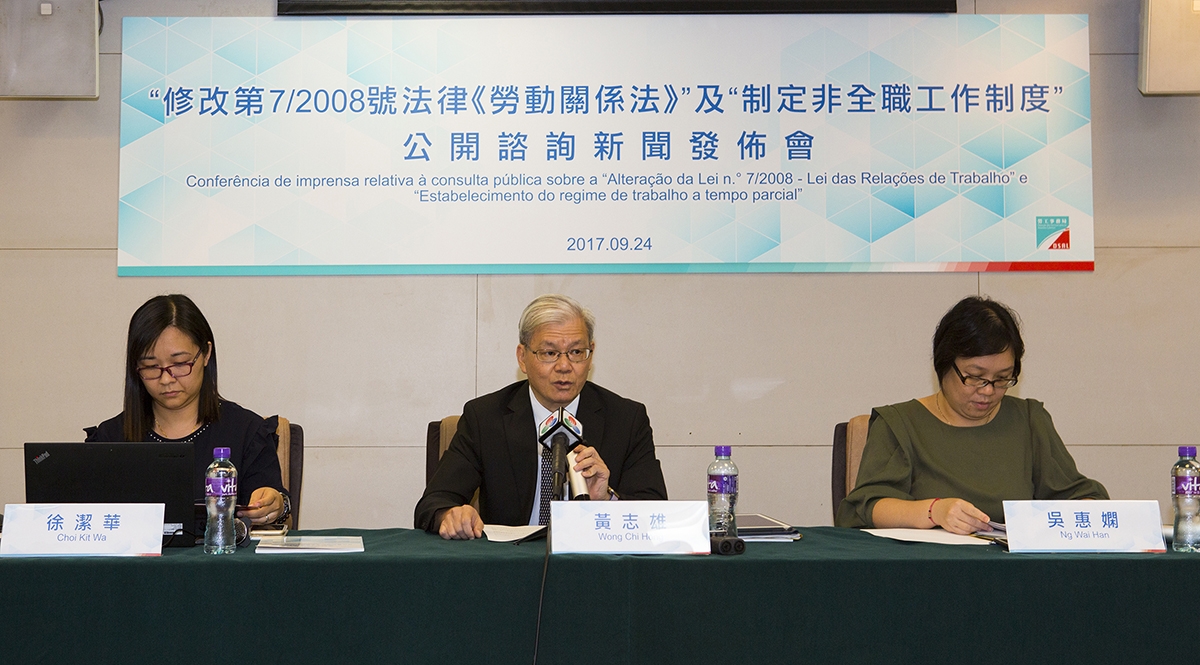 特區政府明(25日)起就“修改第7/2008號法律《勞動關係法》"及“制定非全職工作制度”展開為期45日公眾諮詢。基於兩項立法工作均屬澳門特別行政區勞動政策的整體規範,當中不僅涉及僱主與僱員雙方的勞動權益,還牽涉到社會各界及市民大眾的利益,為使有關法律的修改及制定能更切合並滿足澳門特別行政區的社會實際狀況及發展需求,從而完善現行的相關制度,現誠邀公眾在諮詢期內踴躍發表意見和建議。