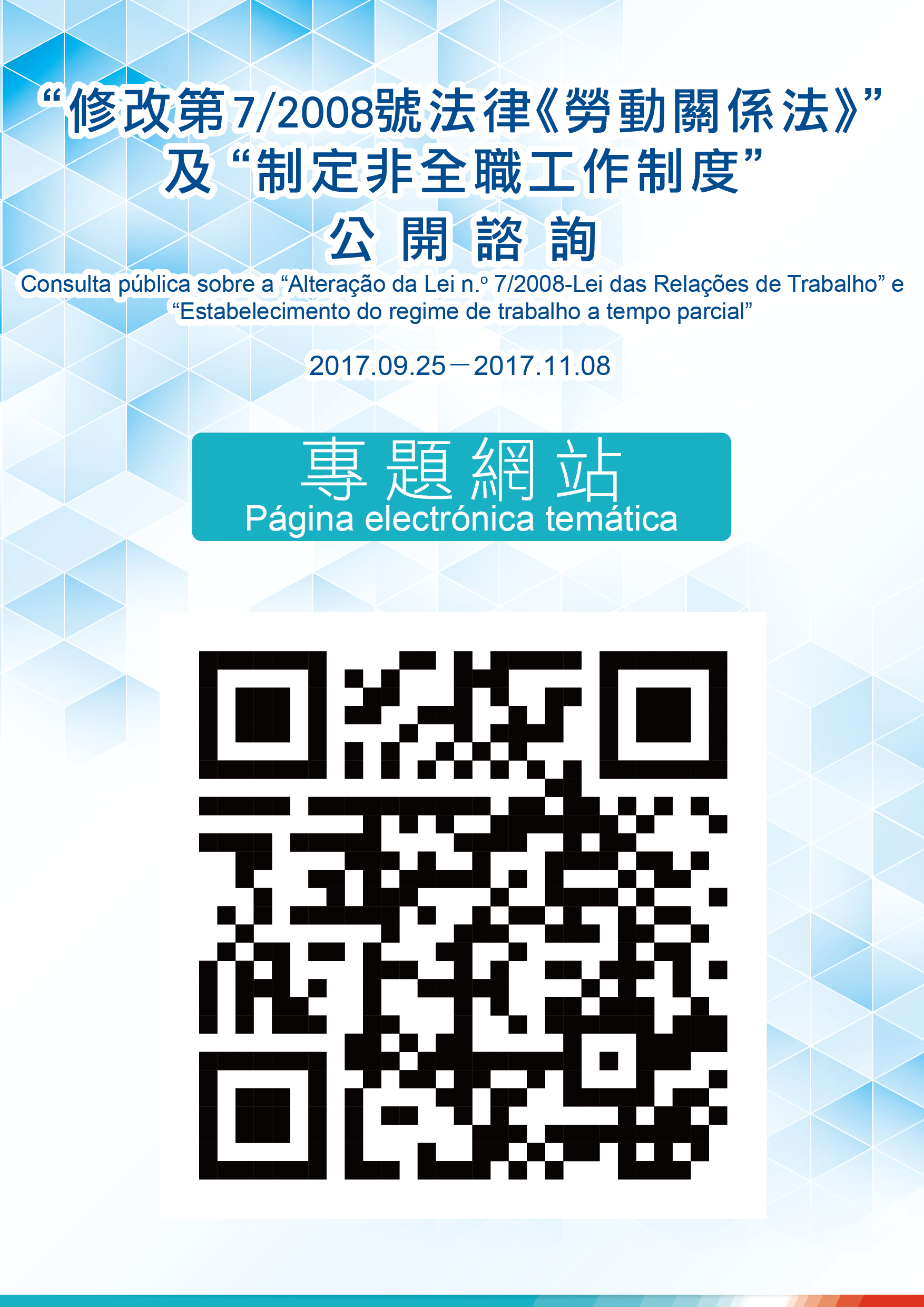 居民並可透過電郵(labourlaw_parttime@dsal.gov.mo)、電話(83999299)、傳真(28581862)、郵寄(馬揸度博士大馬路221-279號先進廣場大廈勞工事務局)等方式提交意見,也可掃描二維條碼直接進入勞工事務局專題網頁發表意見。