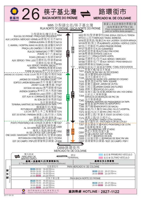 由9月30日(周六)首班車起,往筷子基北灣的26路線取消停靠 “澳門機場”及“機場倉庫”巴士站,而51A路線去回程均新增停靠 “氹仔客運碼頭”站,以進一步優化巴士路線運作和站點安排。交通事務局呼籲乘客留意。