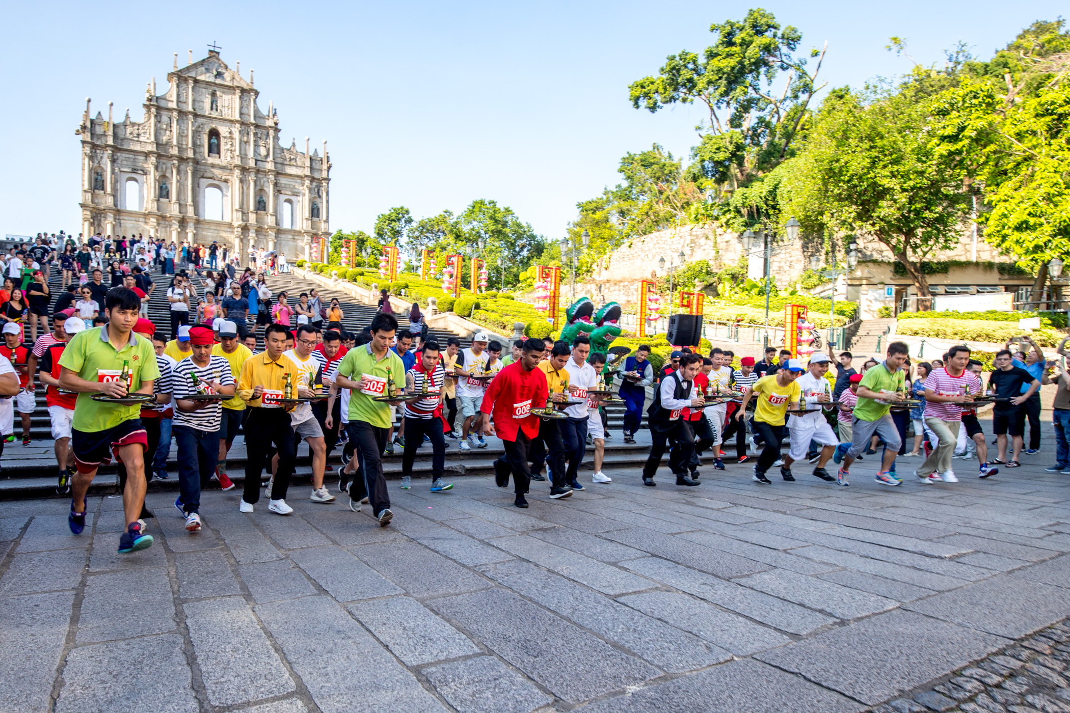 傳統托盤比賽於下午舉行,參賽者穿上特色服飾在大三巴牌坊出發,手持承載一瓶啤酒的托盤穿越“澳門歷史城區”街道,以最快速度將啤酒安全地送到終點議事亭前地,過程刺激有趣,沿途吸引大批旅客駐足拍照甚至替參賽者打氣,展現澳門的旅遊魅力。