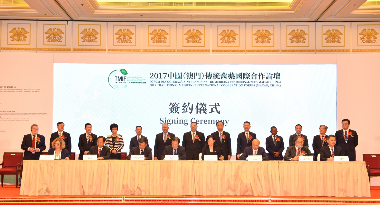 出席本次論壇開幕式的主禮嘉賓還有國家中醫藥管理局局長王國強,國務院港澳事務辦公室副主任黃柳權,中央人民政府駐澳門特別行政區聯絡辦公室副主任姚堅,外交部駐澳門特別行政區特派員公署署理特派員王冬,原莫桑比克衛生部副部長、莫桑比克馬普多中央醫院院長Mouzinho Saíde,四川省人民政府副省長楊興平,澳門特別行政區政府經濟財政司司長梁維特,國家食品藥品監督管理總局代表--藥化註冊司司長王立豐,産業園專家顧問委員會代表、原國家食品藥品監督管理局局長邵明立,原歐盟藥典植物藥委員會主席、德國藥典植物藥委員會主席Gerhard Franz,歐洲中醫基金會副主席Ramòn Maria Calduch,珠海市市委常委、副市長祝青橋,澳門特別行政區政府經濟財政司司長辦公室顧問、粵澳中醫藥科技産業園開發有限公司董事長呂紅等共15位。