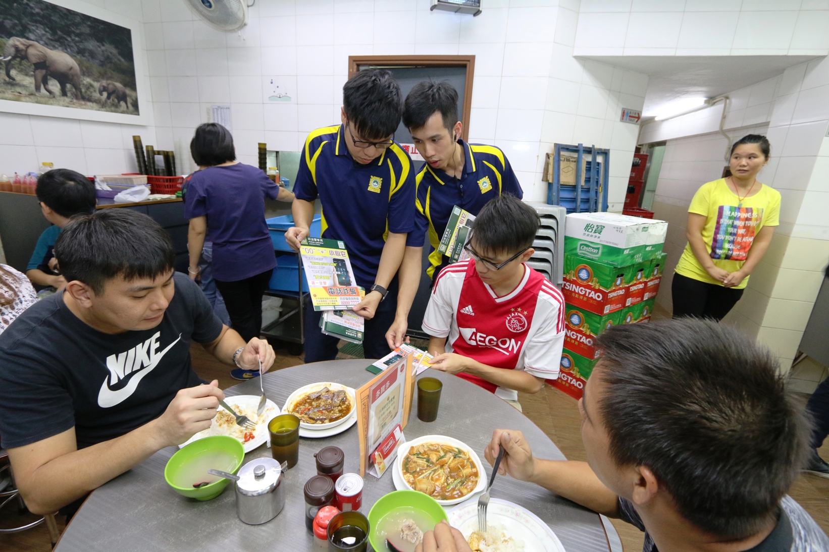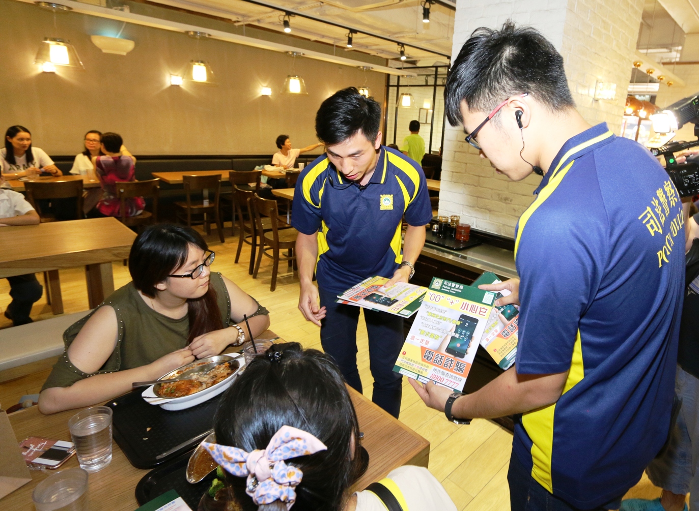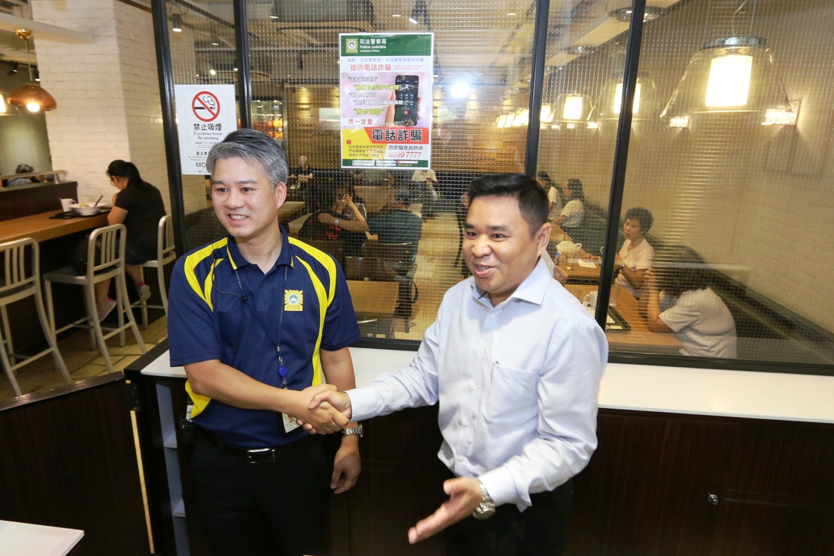 10月12日中午,司警局人員率先前往高士德區的咖啡店、茶餐廳、連鎖商店及快餐店等年輕人喜歡的聚腳點進行宣傳,於店內張貼提防電話詐騙宣傳海報,並向顧客派發防騙宣傳單張,提醒他們如接到來歷不明的電話,尤其是來電顯示為“00”或“+”號字頭的電話號碼,須保持警覺;若對方要求轉帳或匯款,這一定是騙局,切勿上當。