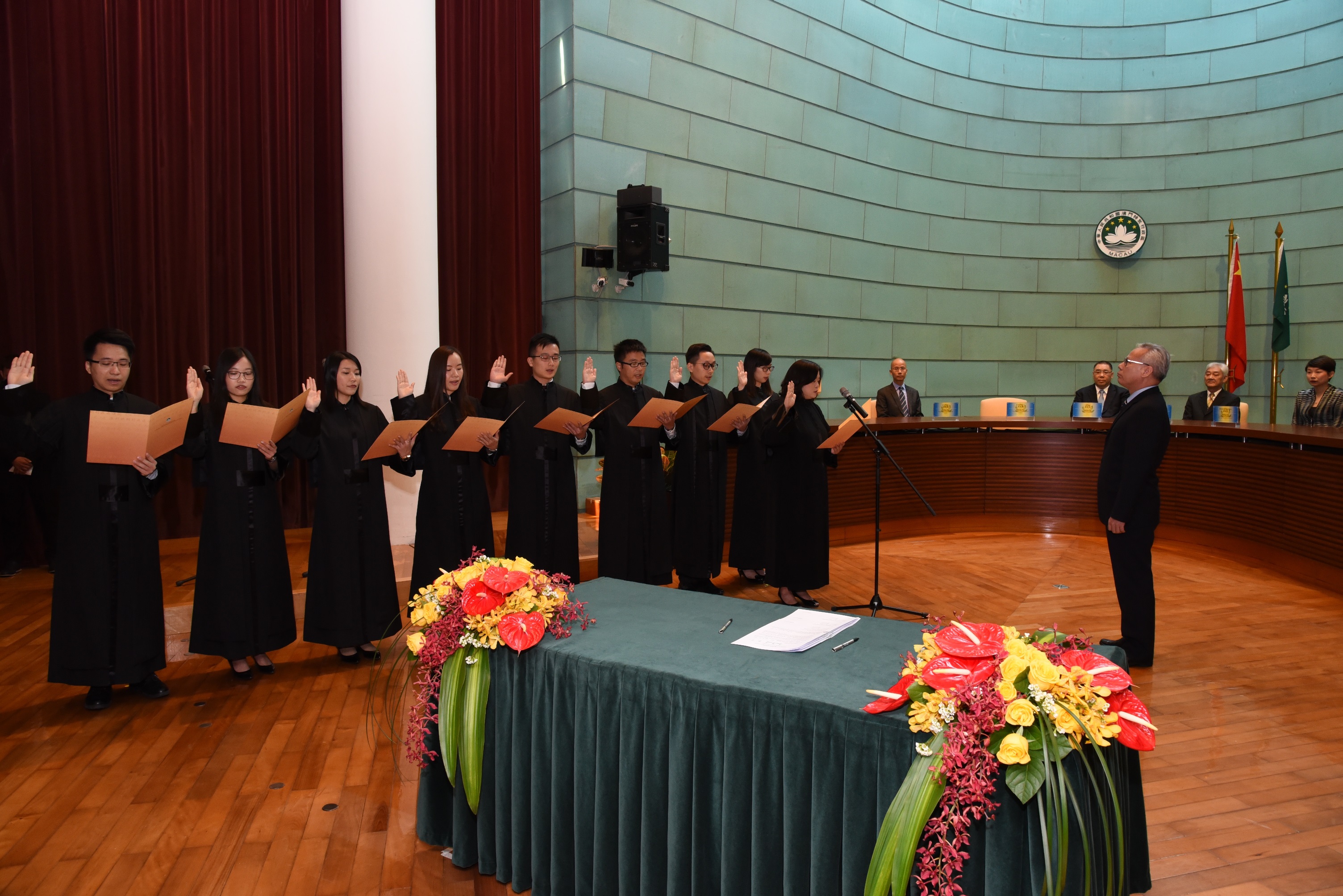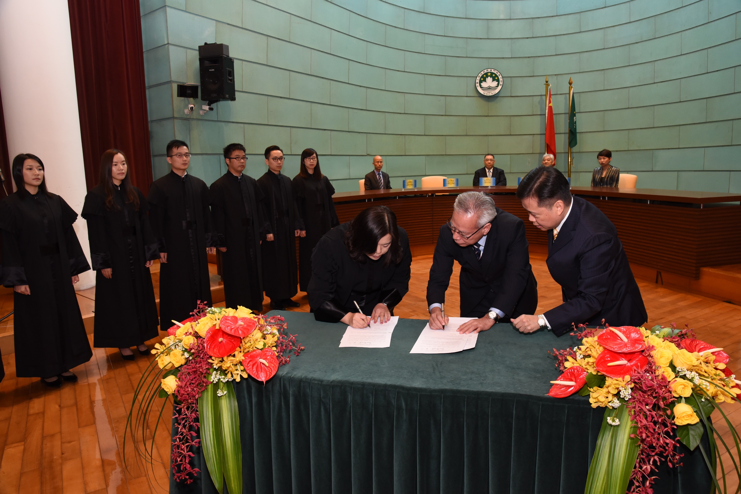 2017年11月1日中午12時正,於終審及中級法院大樓審判庭舉行就職儀式。上述九名法官在終審法院院長岑浩輝主持及監誓下宣誓就職。行政長官崔世安、推薦法官的獨立委員會主席劉焯華、中級法院院長賴健雄和初級法院及行政法院院長姚頴珊列席主禮台。行政法務司司長、廉政專員、推薦法官的獨立委員會委員、各級法院法官及檢察官、相關部門領導等嘉賓以及法院眾多職員出席就職儀式,共同見證九名法官就任新職。