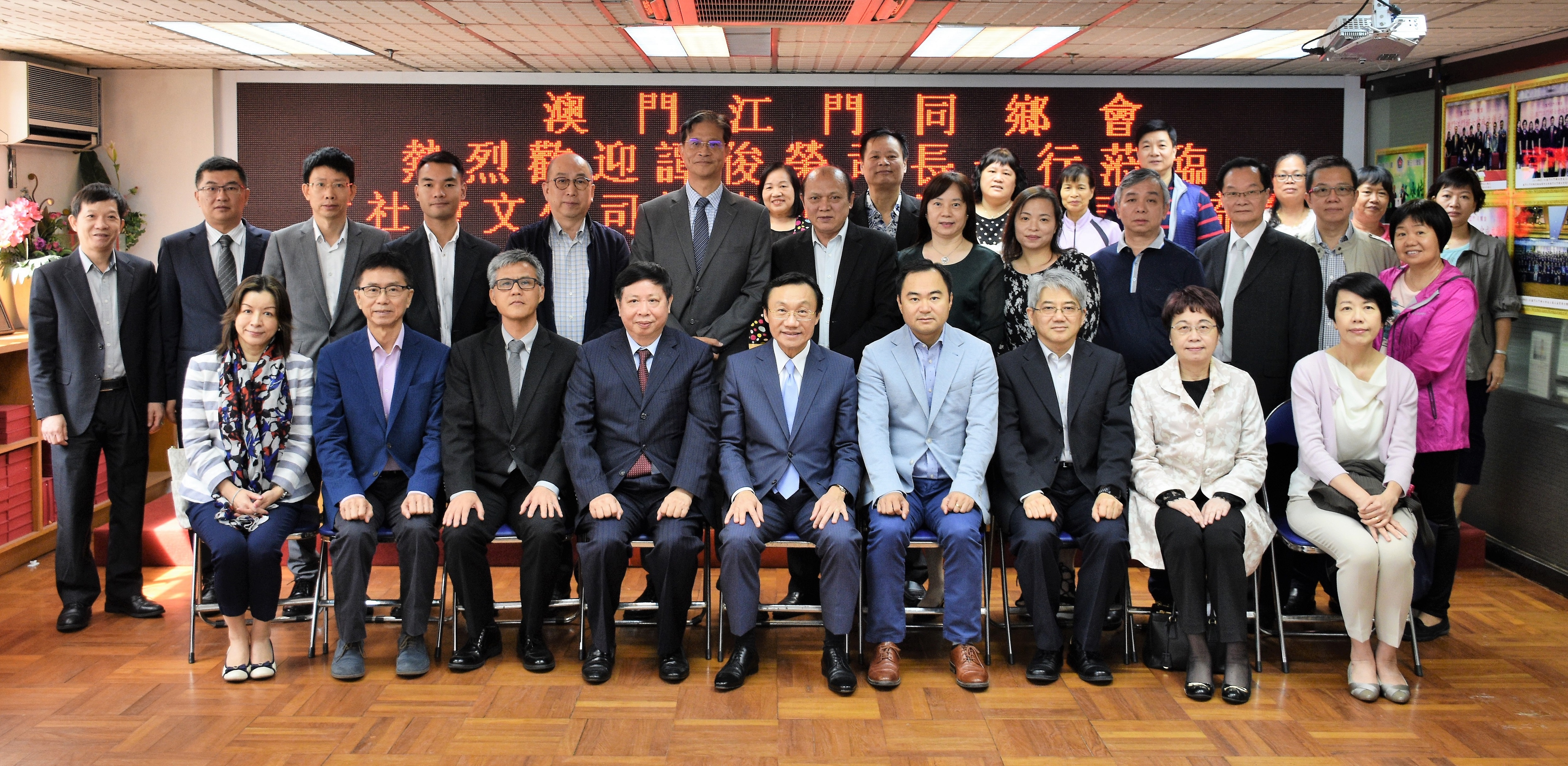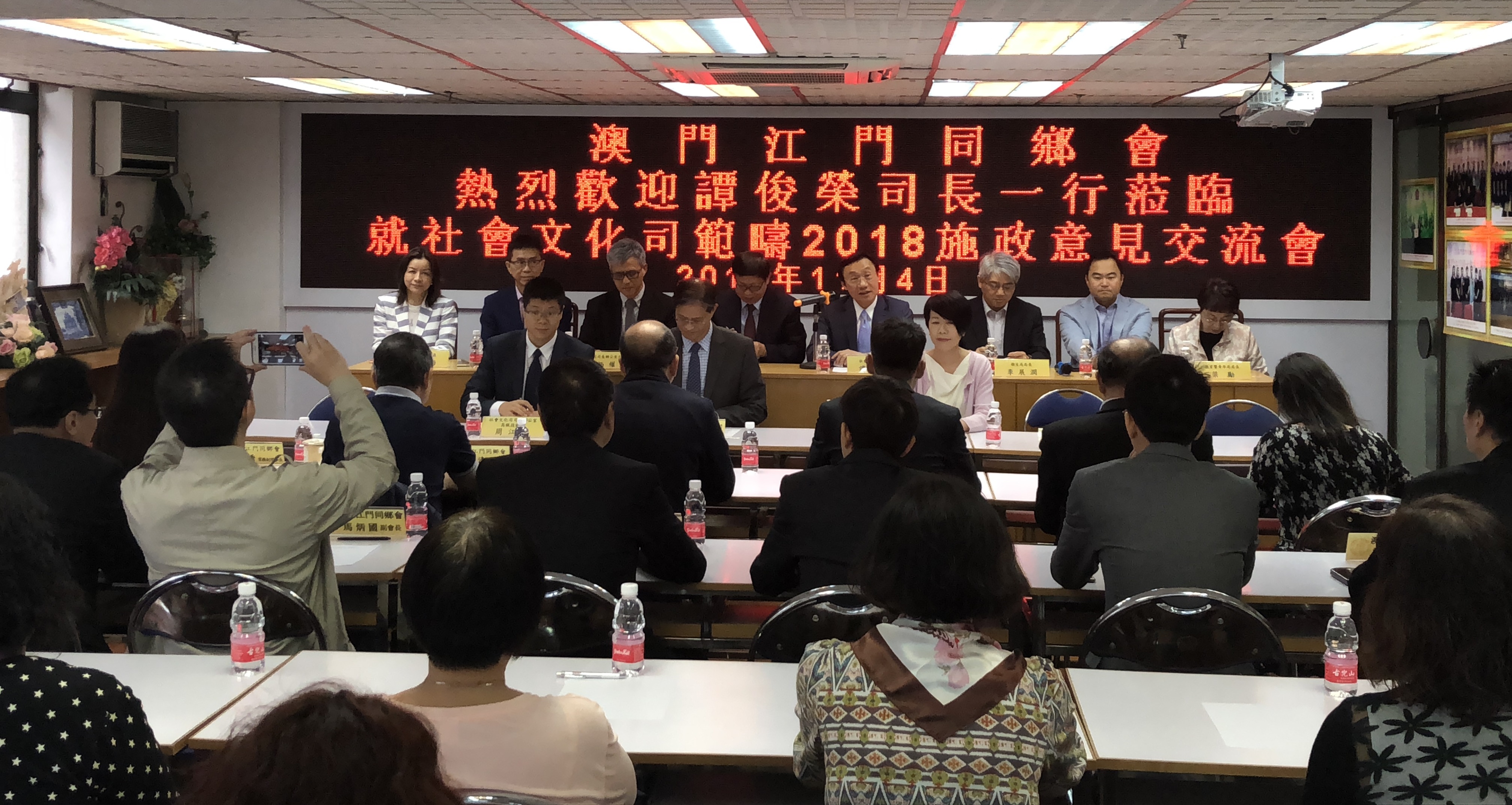 社會文化司司長譚俊榮今(4)日率轄下多個局領導及辦公室顧問,到訪澳門江門同鄉會,就社會文化範疇2018年的施政工作聽取意見。會長甄瑞權、副會長麥瑞權、鄭安庭歡迎譚俊榮等官員到訪,同鄉會領導層及骨幹成員數十人出席交流會。