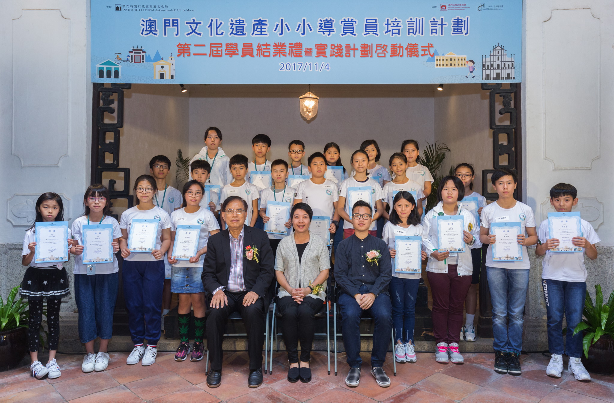由文化局主辦的“澳門文化遺產小小導賞員培訓計劃”日前(十一月四日)於鄭家大屋順利舉行第二屆學員結業禮暨實踐計劃啓動儀式。一眾嘉賓、學員及家長共同見證是次計劃的成果,現場氣氛熱烈,濟濟一堂。出席嘉賓包括文化局文化遺產廳廳長梁惠敏、澳門文物大使協會會長廖嘉豪、澳門文化遺產協會項目主任李雪芬、資深歷史學者鄭國強及資深歷史學者陳樹榮。