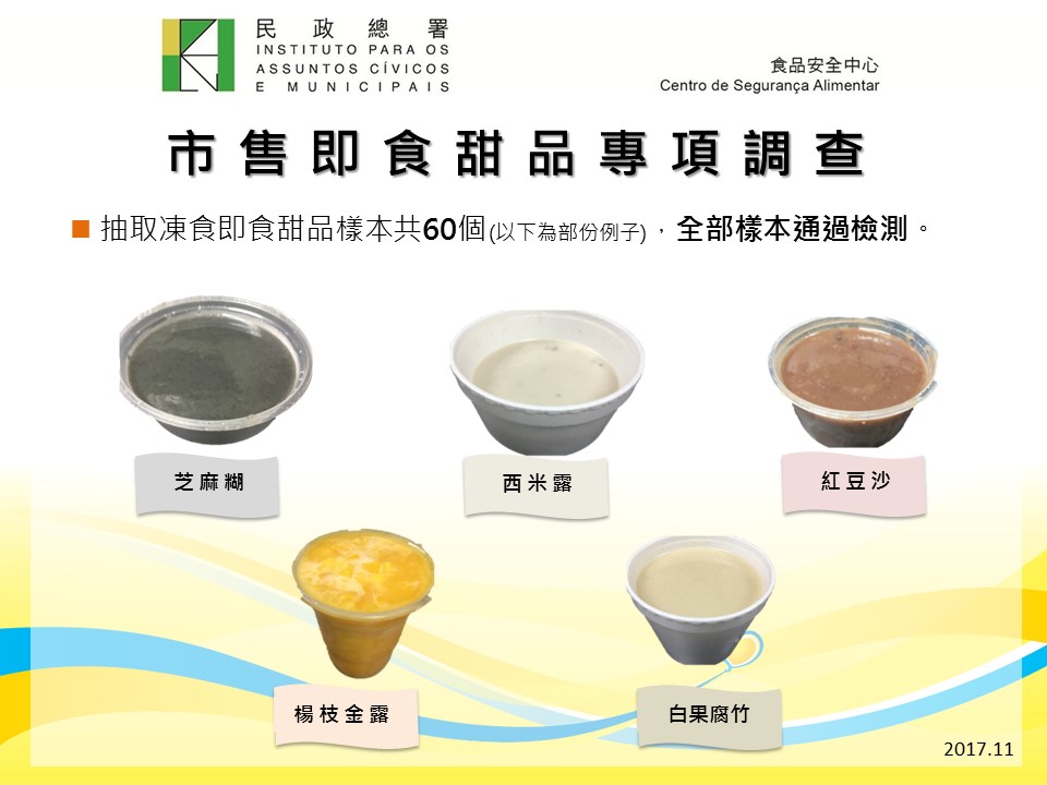 是次專項調查中,民署分別抽查本澳各甜品店、糖水舖及便利商店出售的凍食即食甜品,並進行了致病性微生物的檢測,包括沙門氏菌、金黃色葡萄球菌、產氣莢膜梭狀芽孢桿菌、單核細胞增生李斯特氏菌及蠟樣芽孢桿菌。調查結果顯示全部樣本通過檢測。
