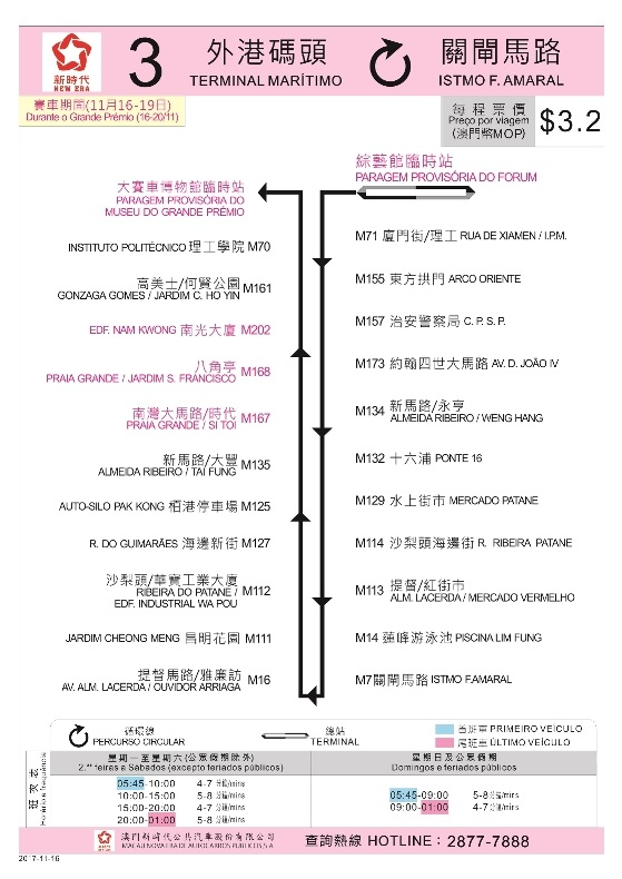 為方便市民瞭解大賽車期間的巴士路線調整安排,除巴士公司會在受影響的巴士站張貼通告外,交通事務局將安排工作人員及交通輔導員在多個主要站點和路口協助乘客候車及維持秩序。如欲瞭解大賽車期間臨時交通安排及巴士調整行程及站點之詳情,可瀏覽交通事務局網頁www.dsat.gov.mo、交通資訊站及巴士報站手機應用程式(App)。