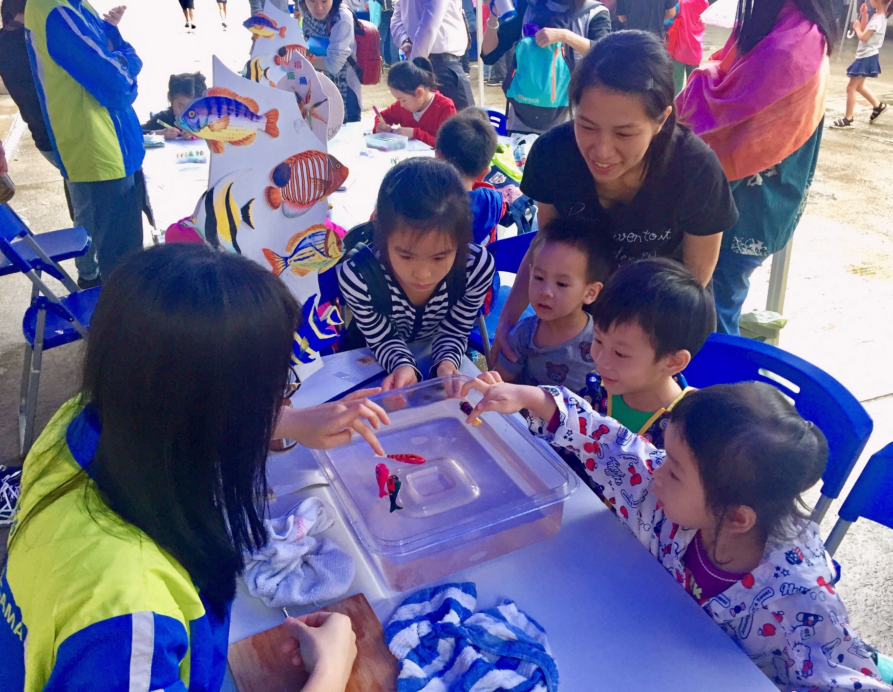 “海安全‧水優質”社區巡禮現場設有多個以航行安全、沙灘旗號及清潔、節約用水、認識鹹潮、維護管理樓宇自來水系統等為主題的攤位遊戲和工作坊,還有“海安全‧水優質”真人版遊戲棋以及指南魚工作坊,有趣互動之餘,大人和小朋友亦能從玩樂中學習到海事及節水知識。期間更上演了精彩的節水話劇,深受小朋友喜愛的“威水超人”和“水汪汪姐姐”現身和大家玩節水遊戲和派禮物,吸引了眾多小朋友踴躍參與。