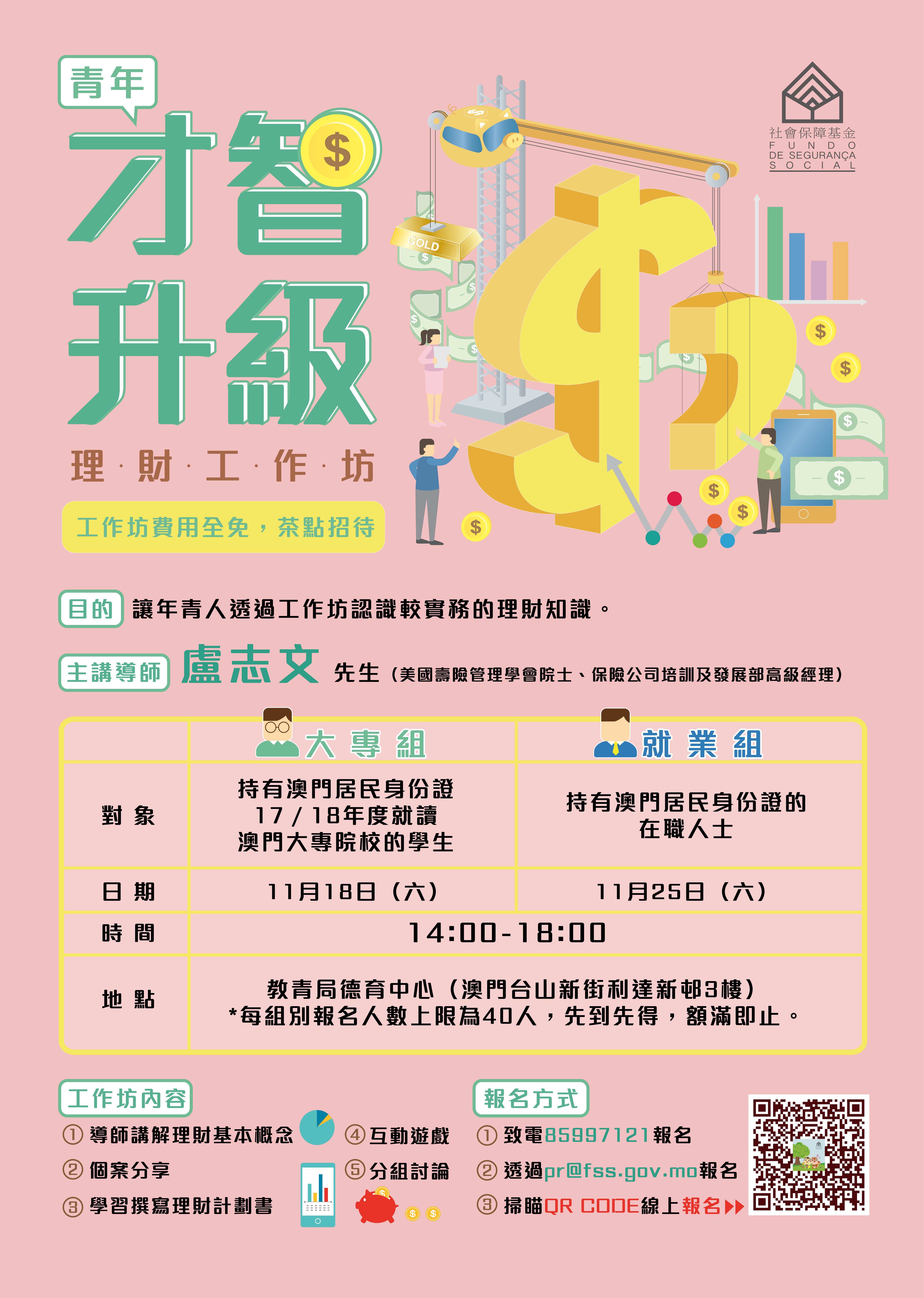 “青年才智升級理財工作坊”分兩場次舉行,凡持有澳門居民身份證、17/18年度就讀澳門大專院校學生可報名參加11月18日(六)舉行的大專組;而持有澳門居民身份證的在職人士則可參加11月25日(六)舉行的就業組。工作坊由下午2時至6時在教青局德育中心(澳門台山新街利達新邨3樓)舉行,導師除講解理財的基本概念外,還會作個案分享和教授理財計劃書的撰寫方法,並透過互動遊戲和分組討論提升學員的理財知識。