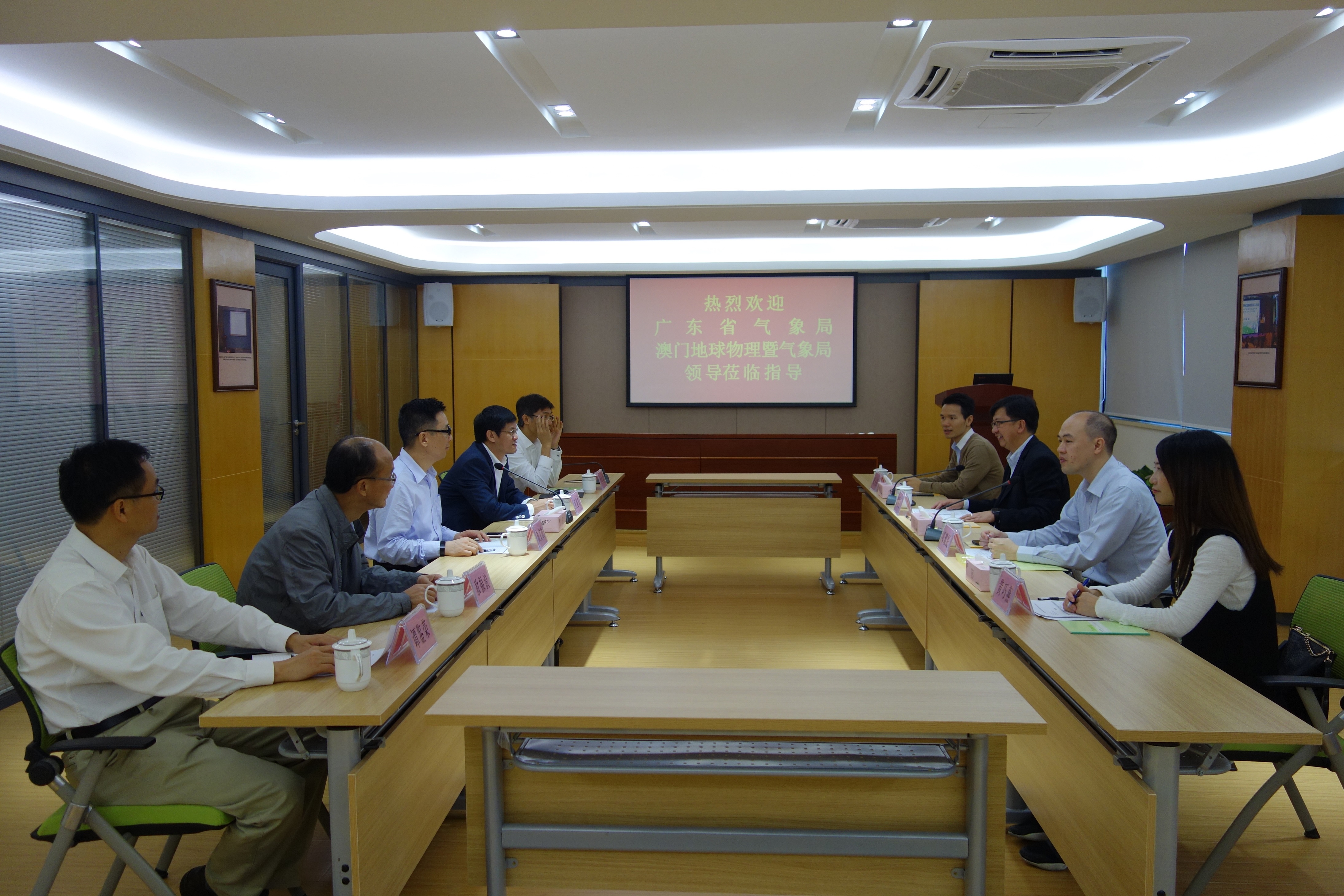 • 地球物理暨氣象局譚偉文局長(右排前二)與廣東省氣象局莊旭東局長(左排前二)商討加強粵澳氣象預報預警合作
