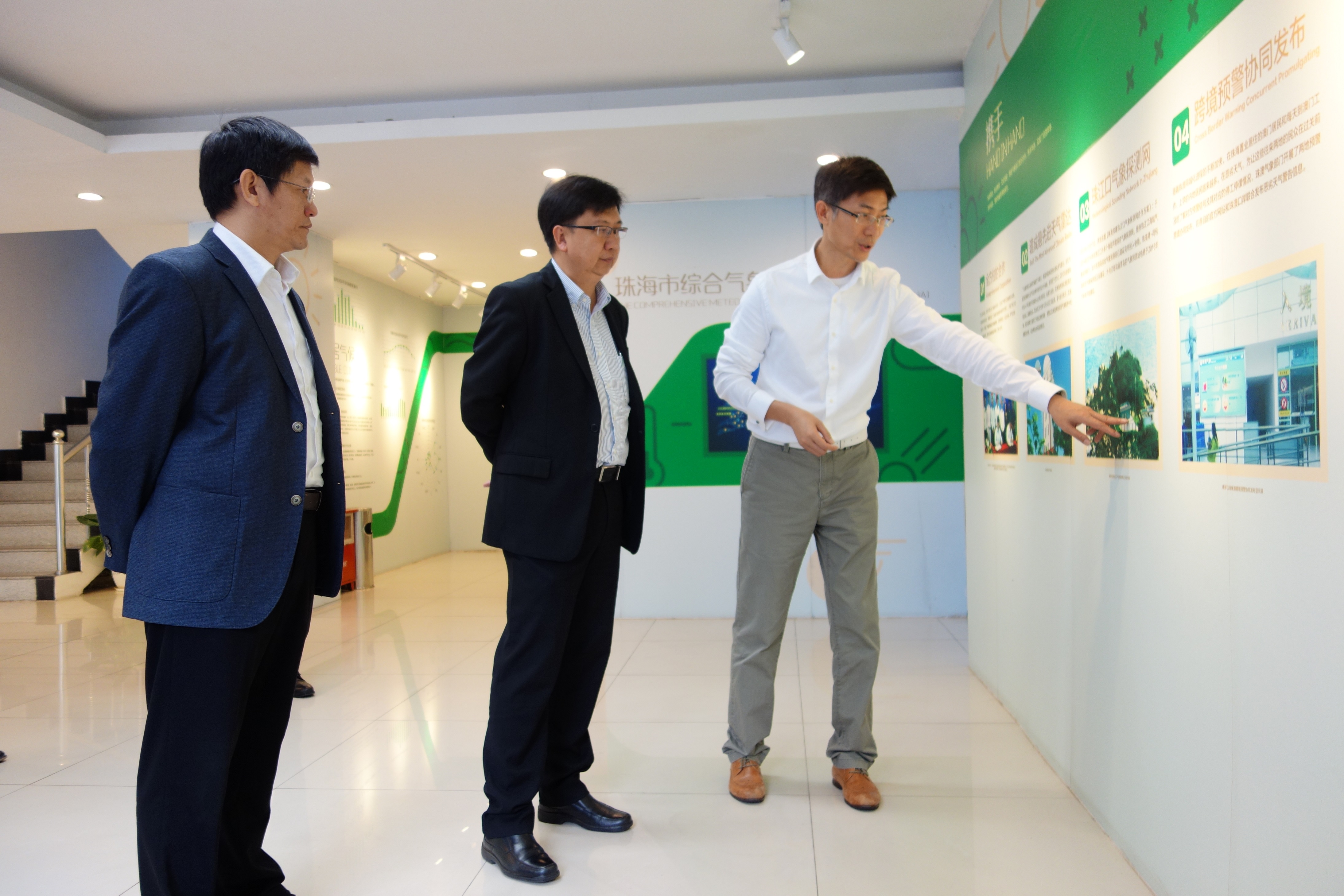 • 地球物理暨氣象局譚偉文局長(中間)和廣東省氣象局莊旭東局長(左一)聽取珠海市氣象局李葉新局長(右一)介紹珠海市氣象局的發展情況