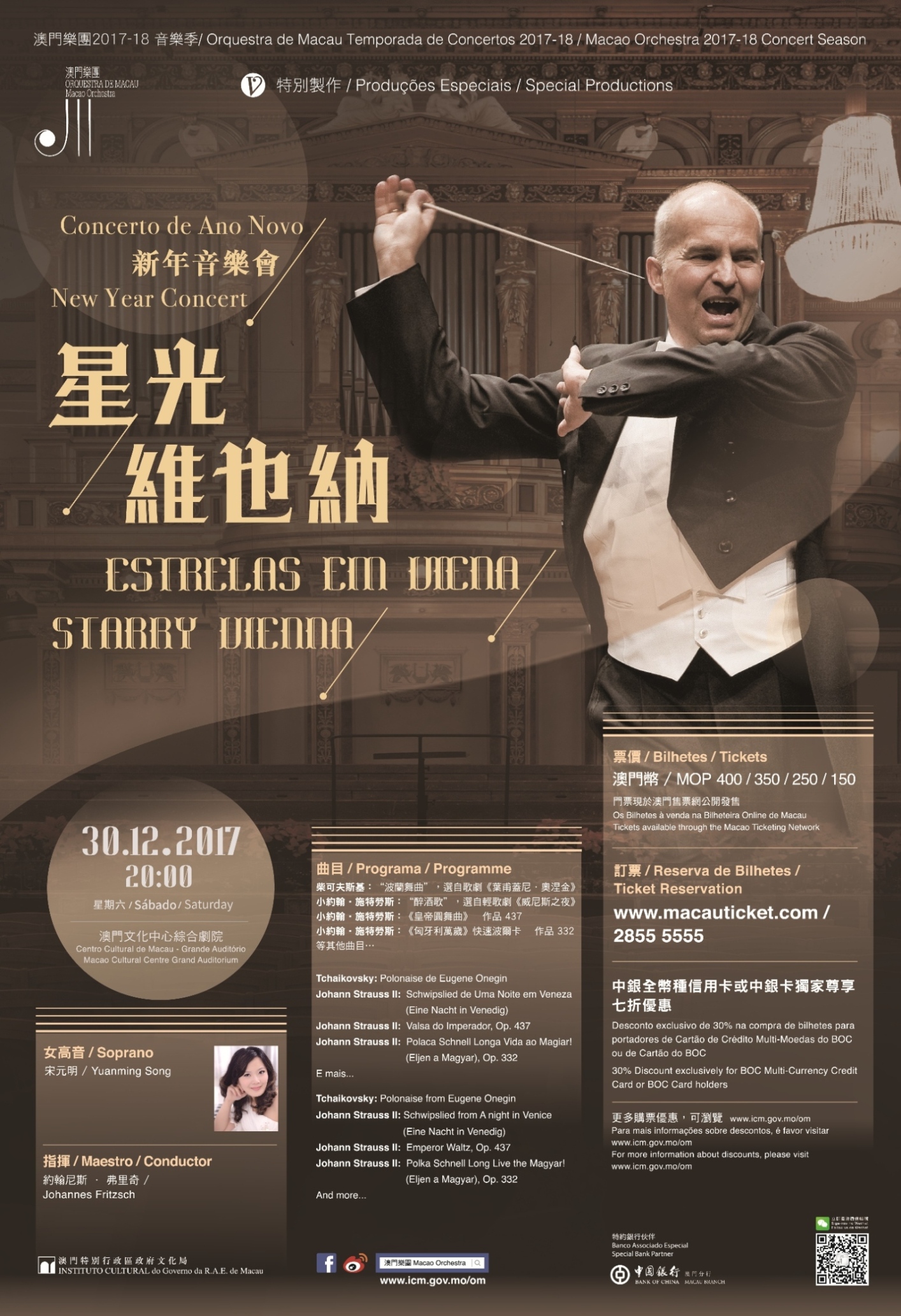 特別製作《星光維也納──新年音樂會》音樂會門票四百、三百五、二百五及一百五澳門元,中銀信用卡或中銀卡用戶購買任何張數門票,可獨家尊享七折優惠,門票現於澳門售票網公開發售。購票熱線二八五五五五五五。詳情及節目查詢可瀏覽澳門樂團網頁www.icm.gov.mo/om。