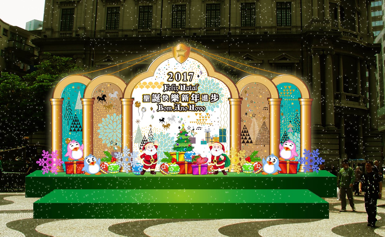 民署將於各主要街道、廣場、公園、休憩區及圓形地等地點佈置燈飾,包括在燈柱間安裝LED碎燈及雪花燈牌,於各主要場地安裝以聖誕節元素為主的大型燈飾,如聖誕鹿車、LED彩色大圓球等,更於議事亭前地、關閘廣場及塔石廣場等設置大型聖誕樹,以及於大堂前地、友誼廣場、塔石廣場及氹仔嘉模前地設置聖誕馬槽,讓全澳各區都洋溢著濃厚的節日氣氛。