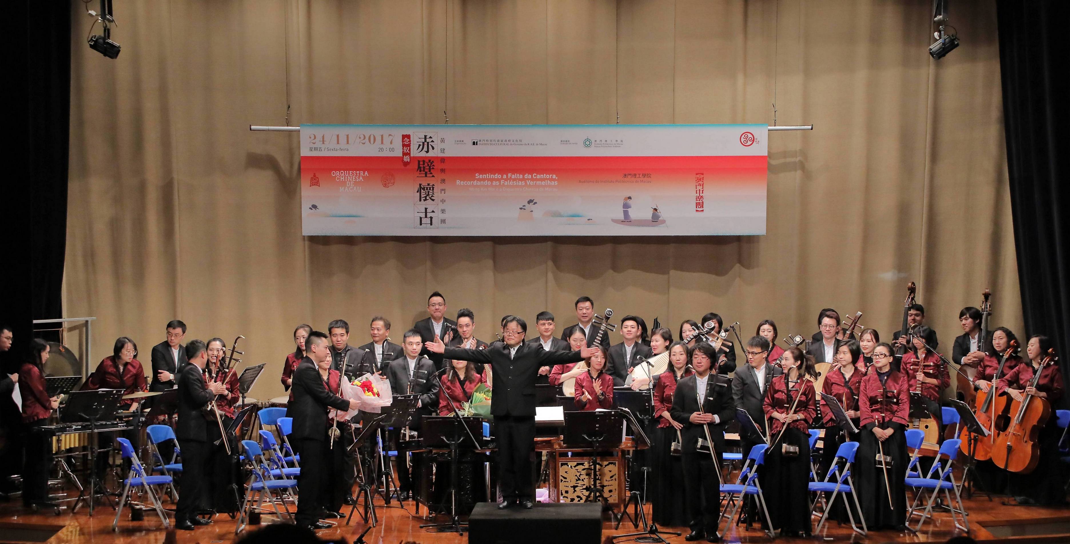 十一月二十四日澳門中樂團於澳門理工學院上演《念奴嬌.赤壁懷古》黃建偉與澳門中樂團音樂會,為中樂團三十周年經典流傳系列獻演多首耳熟能詳的民族樂曲,帶領樂迷回顧中樂團三十年的流金歲月。音樂會以宋朝詞人蘇軾的《念奴嬌•赤壁懷古》命題,特邀著名的古琴演奏家謝東笑及古箏演奏家劉樂,帶來古琴與樂隊的《大江東去》及古箏協奏曲《蒼歌引》等經典樂曲,同時,多位中樂團樂師亦在當晚獻技:李峰板胡獨奏《海之歌》、董禮治二胡獨奏《莫愁女幻想曲》及韋子東笛子領奏《氹仔》等,為整場音樂會揭起高潮,並在觀眾的掌聲中完美落幕。中樂團亦於十一月二十五日在盧廉若公園春草堂舉行的遊園聽曲系音樂會,用民樂扎根於社區,得到廣大市民的歡迎;十一月二十六日在澳門藝術博物館舉行的樂漫博物館系列音樂會,結合展品主題《除冰的文字》,讓樂迷們進一步感受徐冰的藝術底蘊,出席者眾。