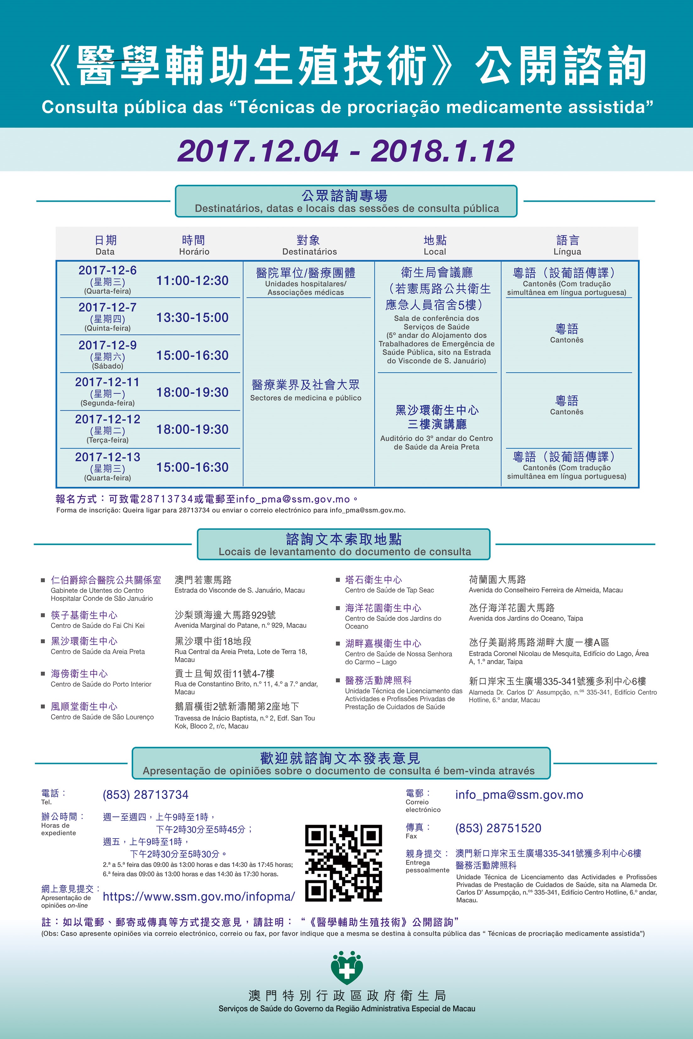 《醫學輔助生殖技術》諮詢文本可於衛生局http://www.ssm.gov.mo內下載,或可在仁伯爵綜合醫院公共關係室、7間衛生中心及醫務活動牌照科共9個指定地點索取,公眾和業界亦可於公開諮詢期間透過電話、電郵、親身提交或以網上意見提交的方式向醫務活動牌照科提出相關意見或建議。