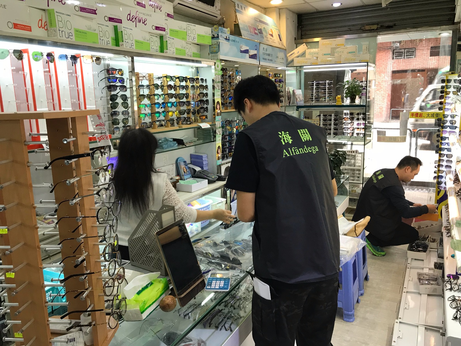 澳門海關於本月二十八日採取行動,關員分成多個小隊,突擊搜查涉案的七間眼鏡店,而品牌權利人亦協助作現場鑑定。海關人員在七間涉案店舖內共查獲假冒多個名牌商標的眼鏡,包括有太陽眼鏡及光學眼鏡合共一千五百零七副,若以正貨市值估算,總值約一百五十萬澳門元。