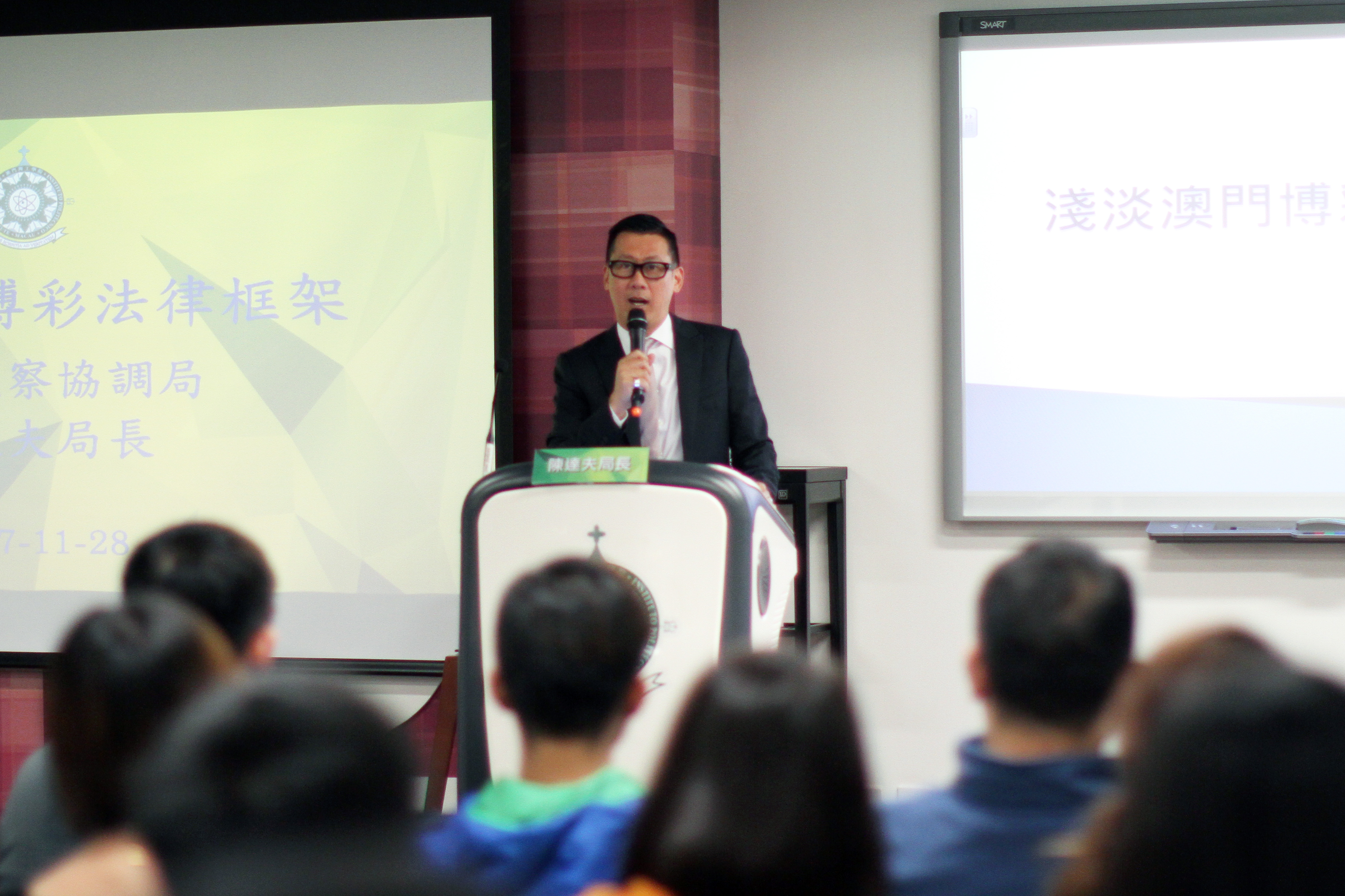 二〇一七年十一月二十八日上午,應澳門理工學院博彩教學暨研究中心邀請,博彩監察協調局陳達夫局長為理工博彩與娛樂管理專業學士學位課程的學生作了澳門博彩法律制度的講座。陳局長從博彩活動的本質及特徵講起,為同學們講解了娛樂場幸運博彩經營、進入娛樂場的條件、博彩中介人、博彩信貸以及預防及遏止清洗黑錢等主要博彩法律制度,同時也觸及當前的熱點法律問題。陳局長的講座提綱挈領,深入淺出,同學們均表示大受其益。