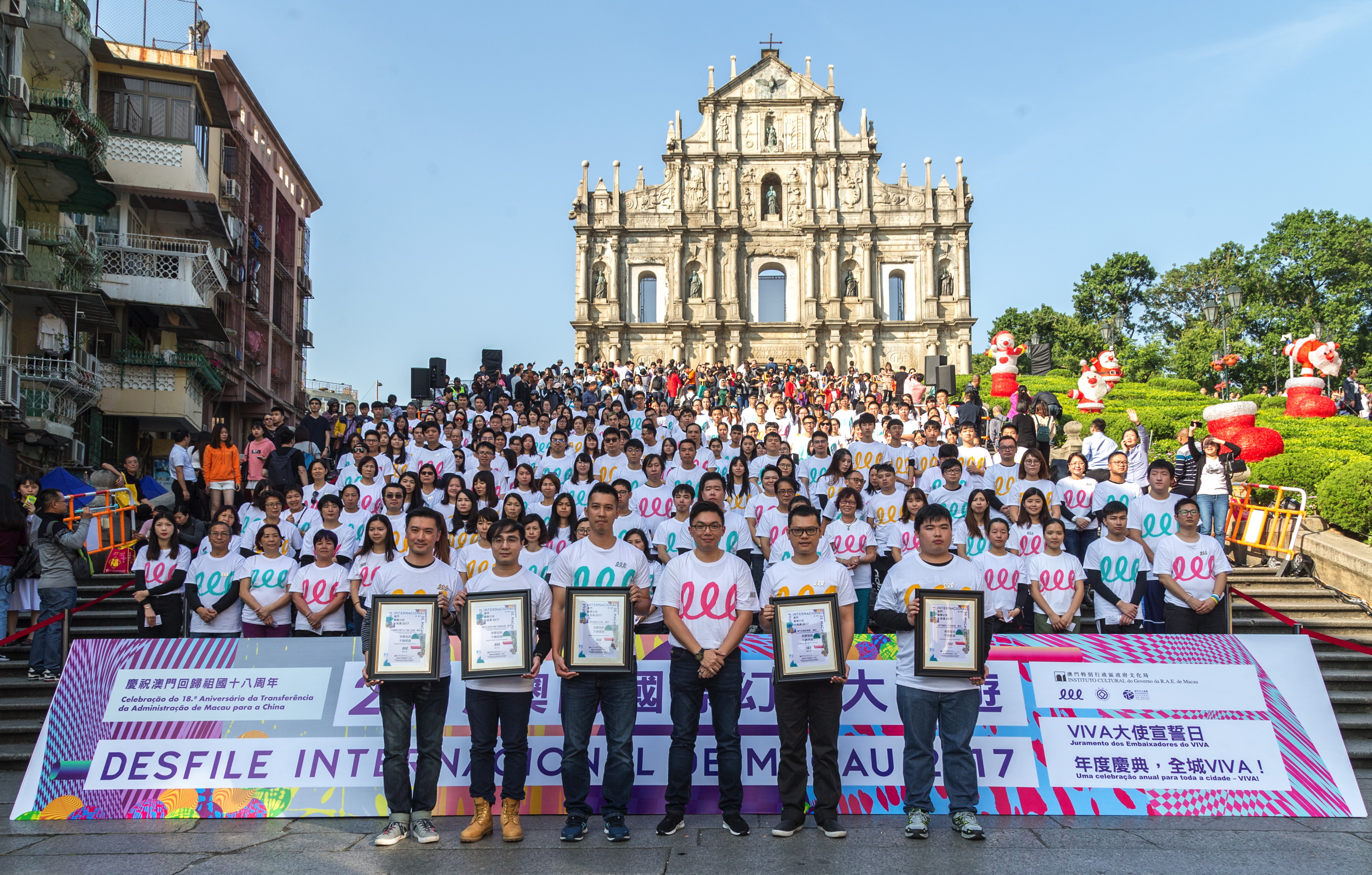 由文化局主辦、慶祝澳門回歸祖國十八周年《2017澳門國際幻彩大巡遊》於十二月十七日(星期日)舉行。文化局今年續與多個本地單位合作,招募公眾參與大巡遊“VIVA大使”團隊,協助大巡遊舉行期間各項協調工作。一眾“VIVA大使”於今日(十二月二日)下午三時在大三巴牌坊耶穌會紀念廣場一同宣誓,投入參與大巡遊工作。