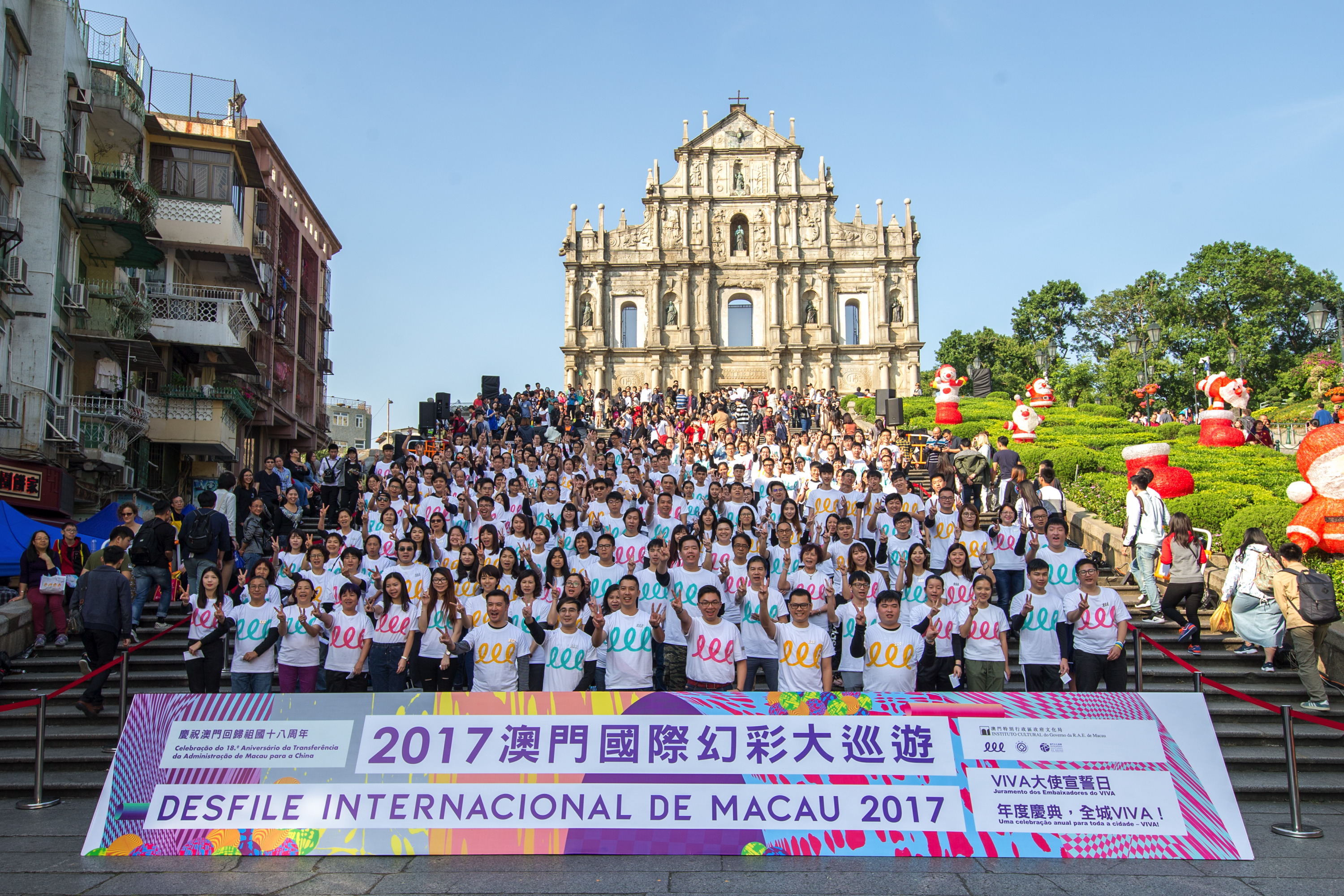 由文化局主辦、慶祝澳門回歸祖國十八周年《2017澳門國際幻彩大巡遊》於十二月十七日(星期日)舉行。文化局今年續與多個本地單位合作,招募公眾參與大巡遊“VIVA大使”團隊,協助大巡遊舉行期間各項協調工作。一眾“VIVA大使”於今日(十二月二日)下午三時在大三巴牌坊耶穌會紀念廣場一同宣誓,投入參與大巡遊工作。