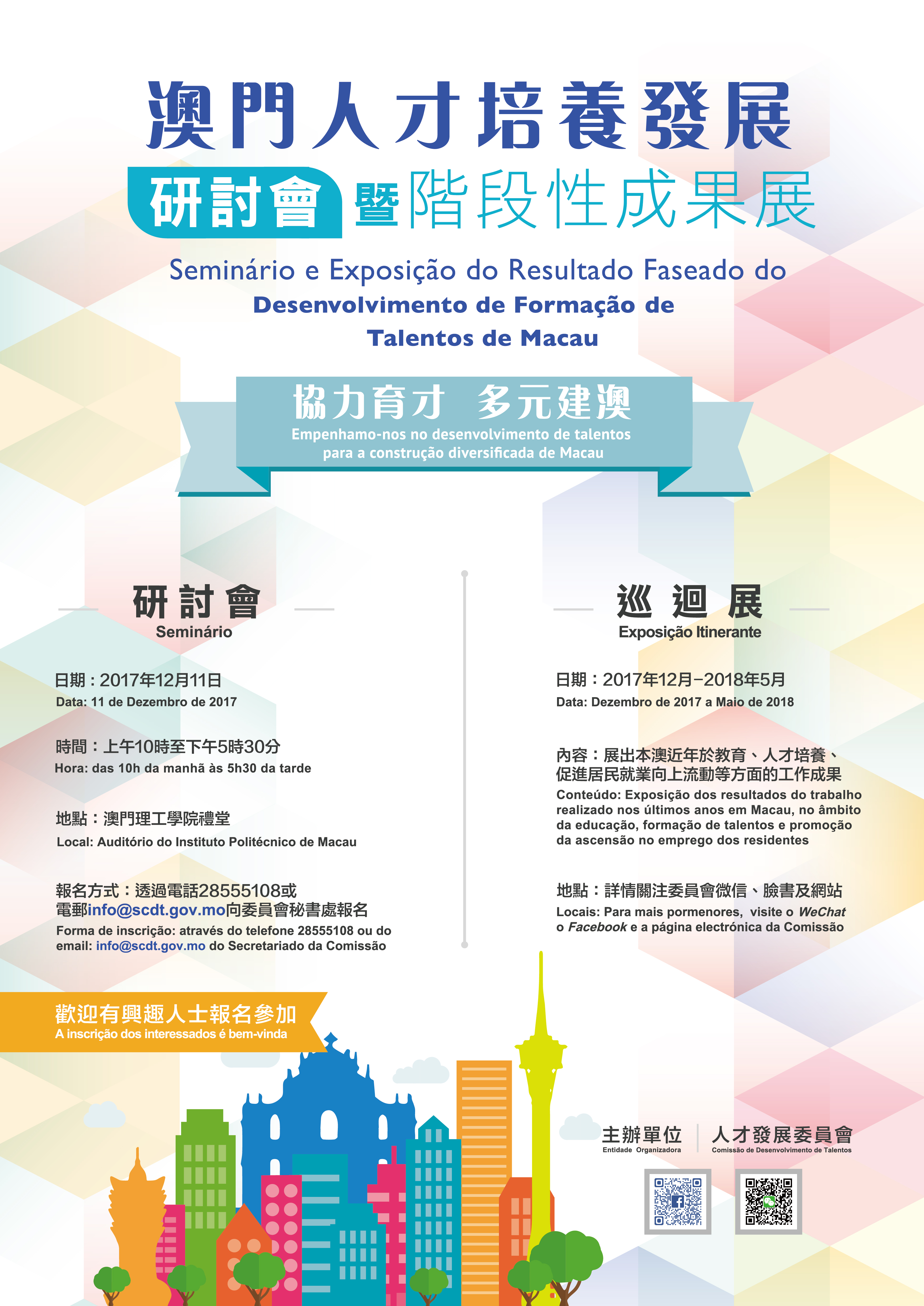 研討會同場還會舉行特區政府近年在培養人才方面的工作成果展,展板將在本澳大專院校、政府服務中心及社團等多個地方作巡迴展覽,展期由2017年12月至2018年5月,巡迴展覽的地點可於人才發展委員會網站(http://www.scdt.gov.mo )最新消息欄目查閱。