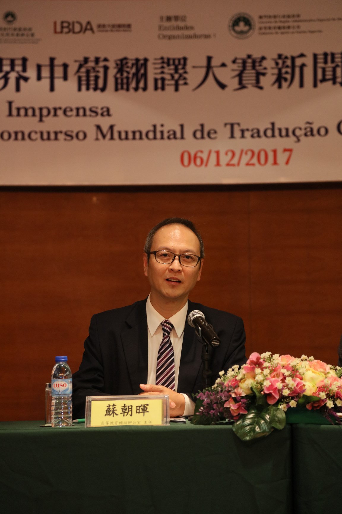第二屆世界中葡翻譯大賽新聞發佈會12月6日(星期三)下午四時在澳門理工學院舉行,由高等教育輔助辦公室蘇朝暉主任、澳門理工學院院長李向玉教授、澳門理工學院副院長嚴肇基教授及第二屆世界中葡翻譯大賽學術組組長李長森教授主持,介紹比賽章程及詳情。蘇朝暉主任在新聞發佈會上指出澳門作為中葡雙語人才培訓基地,高等教育輔助辦公室一直支持澳門的高等院校推動中葡雙語人才。去年在理工學院的倡議下,聯手舉辦首屆世界中葡翻譯大賽,成績有目共睹。蘇朝暉主任期望第二屆世界中葡翻譯大賽能夠吸引更多隊伍參賽,再創佳績。李向玉院長致辭時表示澳門理工學院一直著力於中、葡雙語翻譯的教學工作,舉辦中葡翻譯大賽是為了加強世界範圍內高等院校學生之間中葡語言翻譯技術的交流、更好地培養中葡翻譯專才、發揮中葡翻譯“百年老校”的優勢,為葡語的教學和推廣做出應有的貢獻。李向玉教授預祝第二屆世界中葡翻譯大賽圓滿成功。