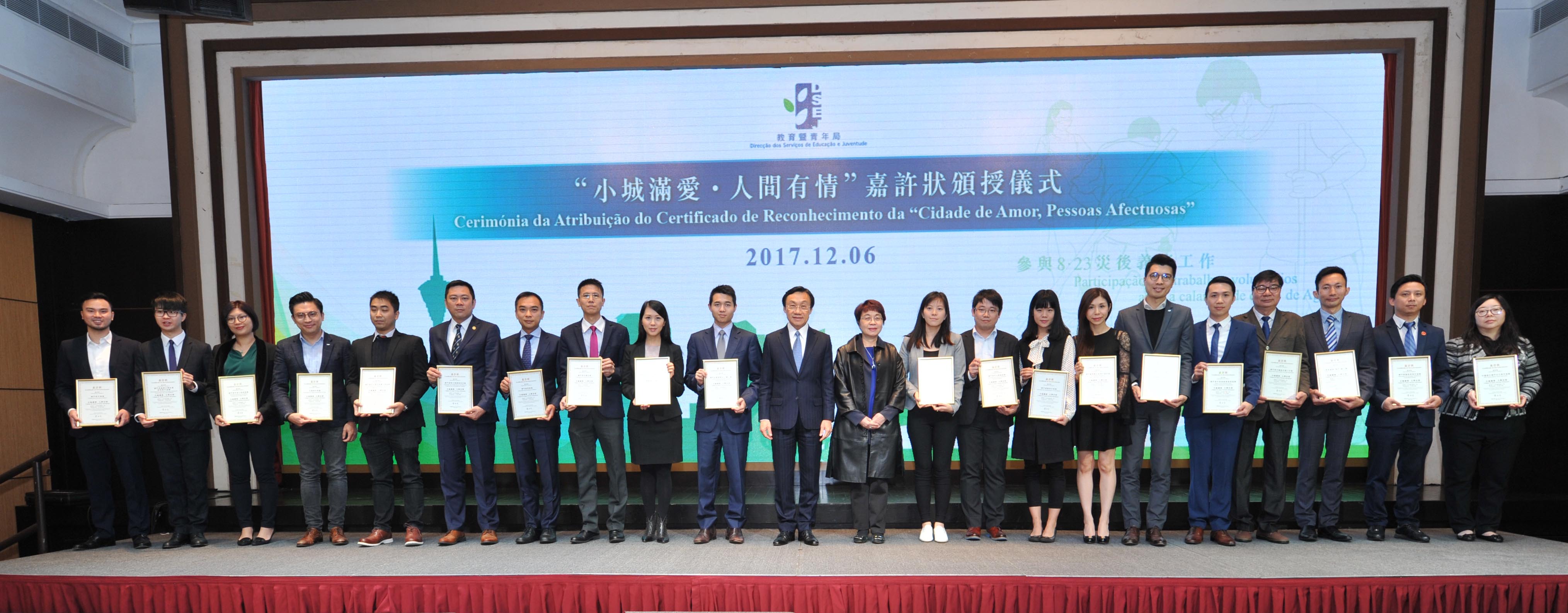非高等教育委員會和青年事務委員會於12月6日下午假旅遊塔舉行聯合座談會。會議由兩個委員會的主席、社會文化司司長譚俊榮主持。會前舉行了“學校發展計劃”資助申請之“申請範疇ISO9001:2015質量管理體系認證”證書頒授儀式,並由譚俊榮向參與8.23災後義務工作的青年社團頒發了“小城滿愛‧人間有情”嘉許狀。
