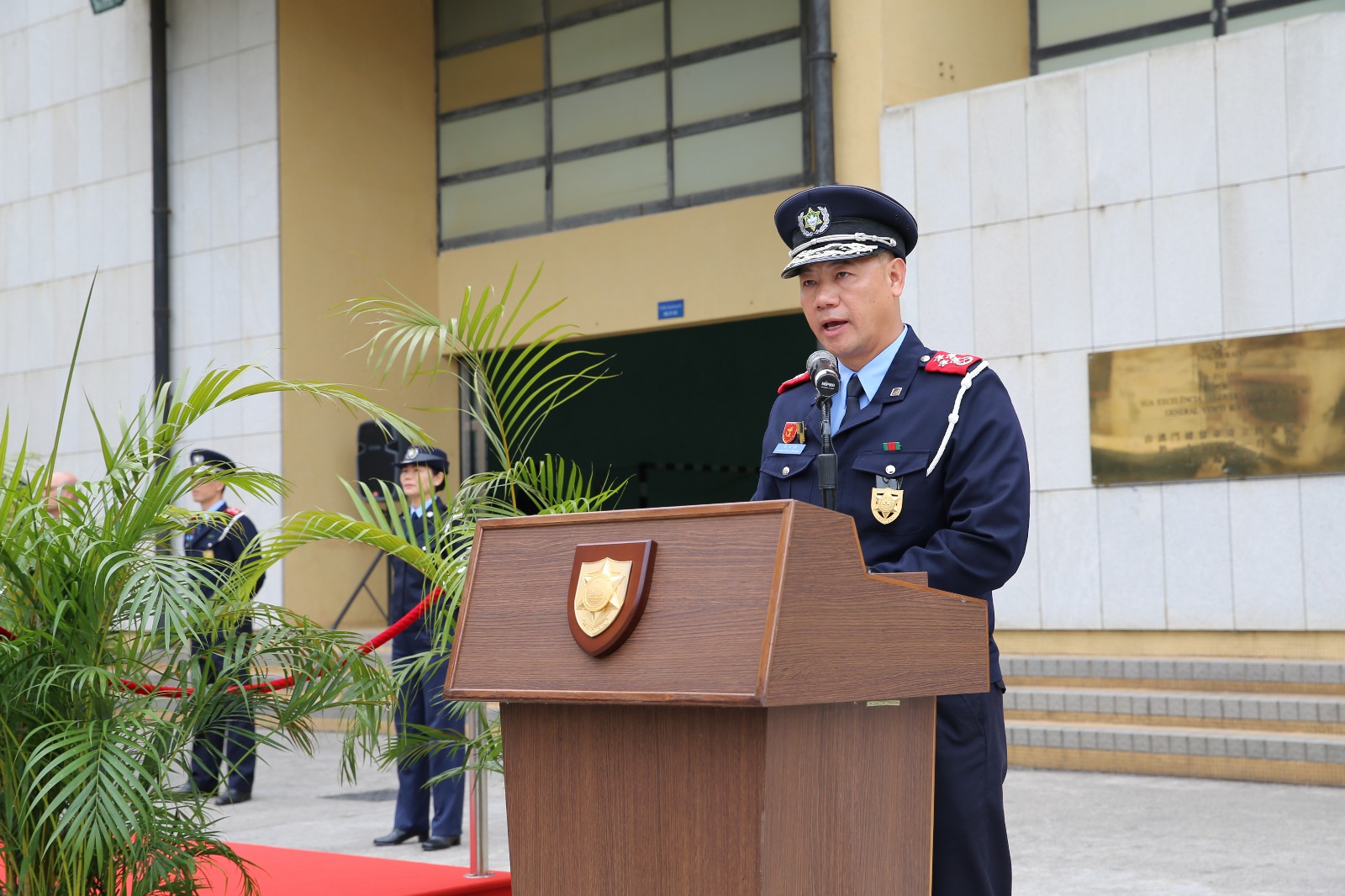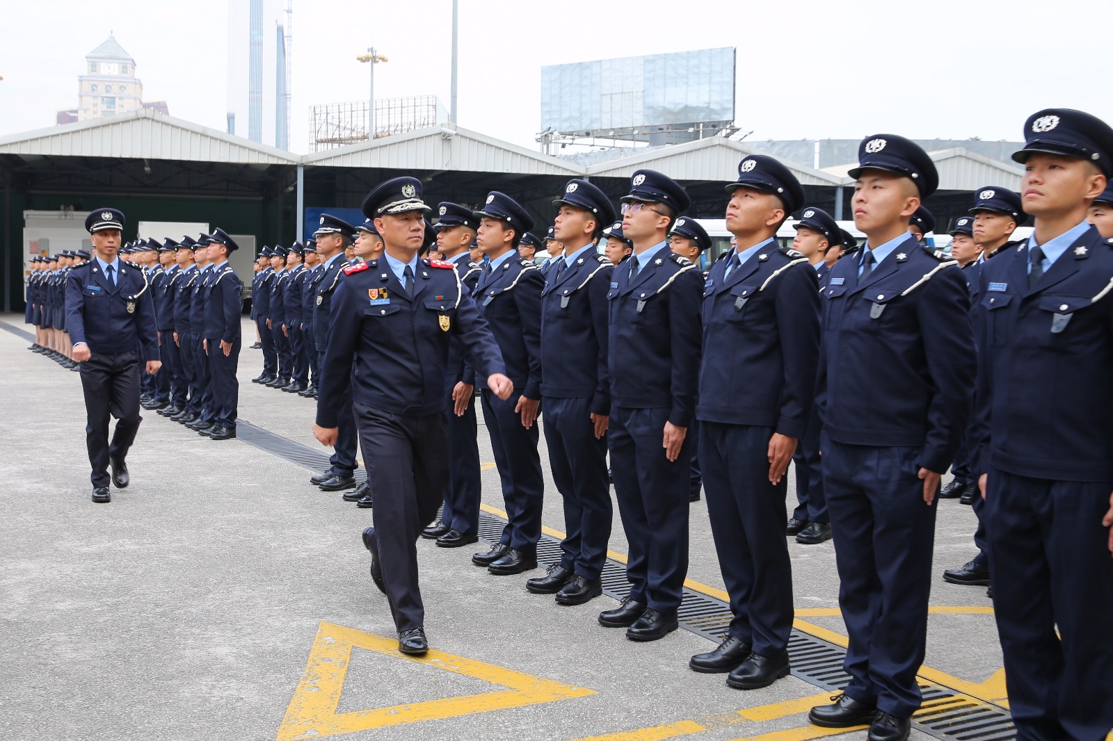 今天(12月12日)中午12時,在治安警察局特警隊大樓內為新入職警員舉行就職典禮。儀式由治安警察局局長梁文昌警務總監及副局長黃子暉副警務總監主持,各部門主管均有出席,並為新警員戴上警章。梁文昌局長於致辭中,勉勵所有新警員時刻竭盡所能、服務社會。