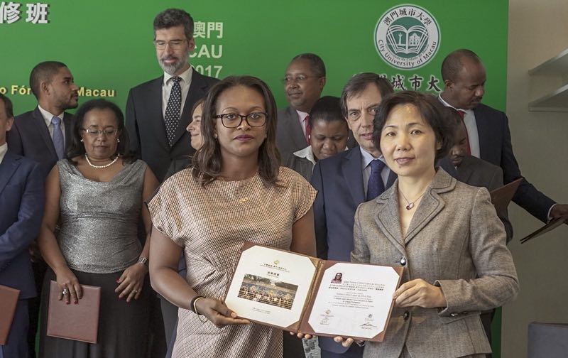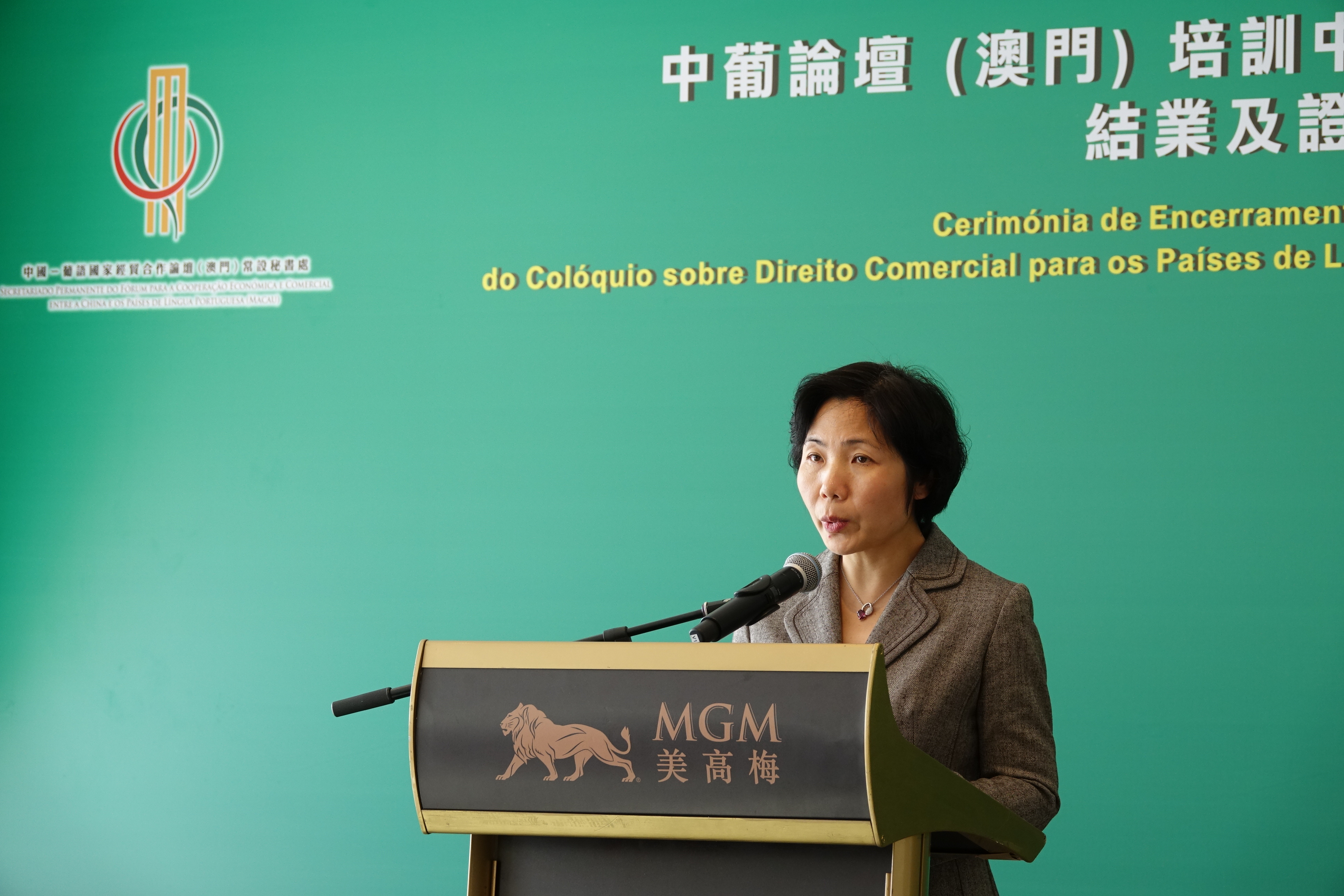 由中葡論壇(澳門)培訓中心主辦、澳門城市大學承辦的“葡語國家商法研修班”於12月18日假澳門美高梅酒店舉行結業典禮暨證書頒發儀式。中葡論壇(澳門)常設秘書處徐迎真秘書長、中央人民政府駐澳門特別行政區聯絡辦公室經濟部王家寶副部長級助理、莫桑比克駐澳總領事館領事事務公使銜參贊法蘭西斯古‧多明古斯‧曼尼薩先生、澳門城市大學孔繁清副校長以及論壇各葡語國家派駐代表等出席典禮。徐迎真秘書長、孔繁清副校長和研修班輪值班長若阿金·莫瑞斯先生分別致辭。