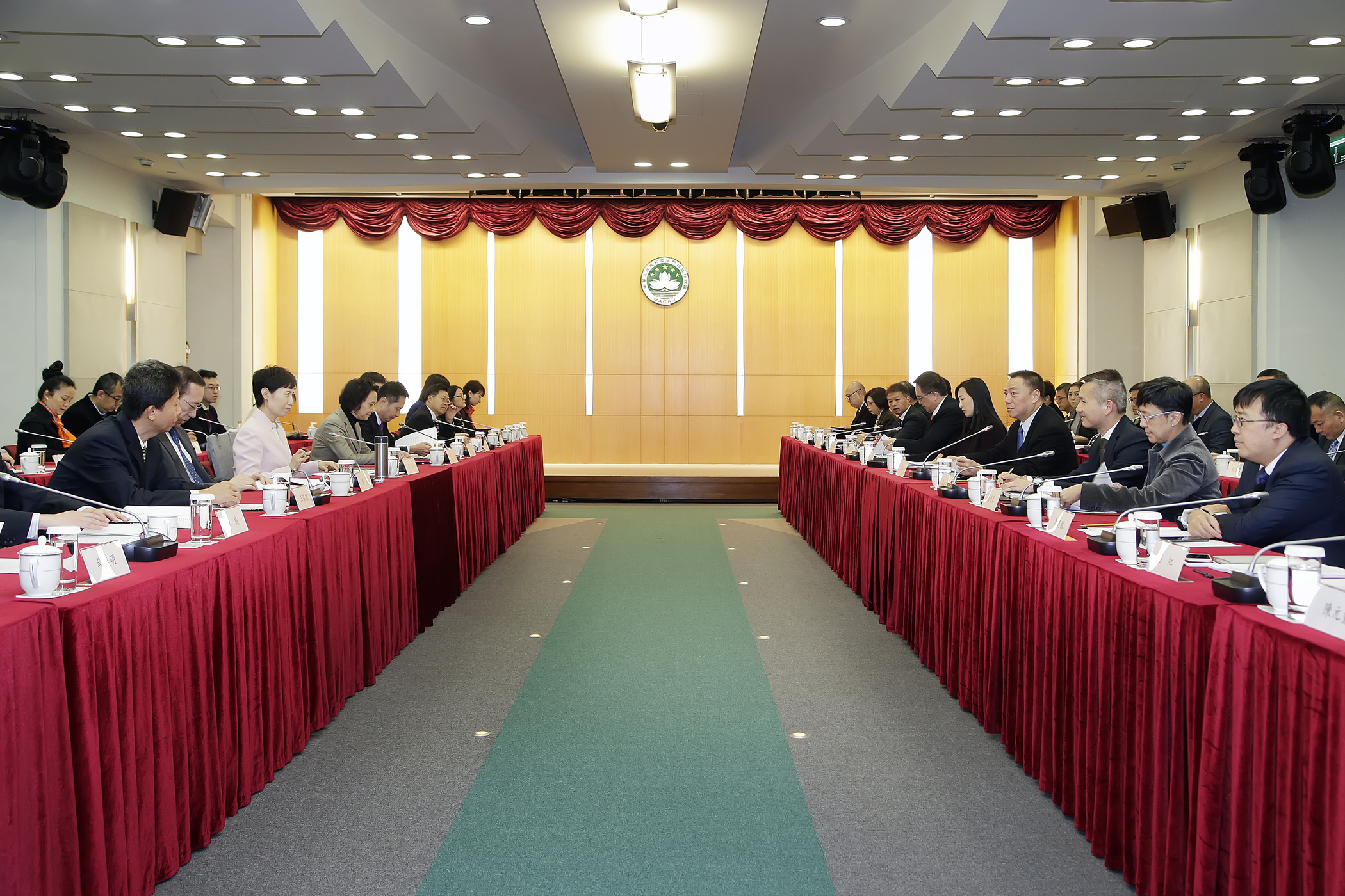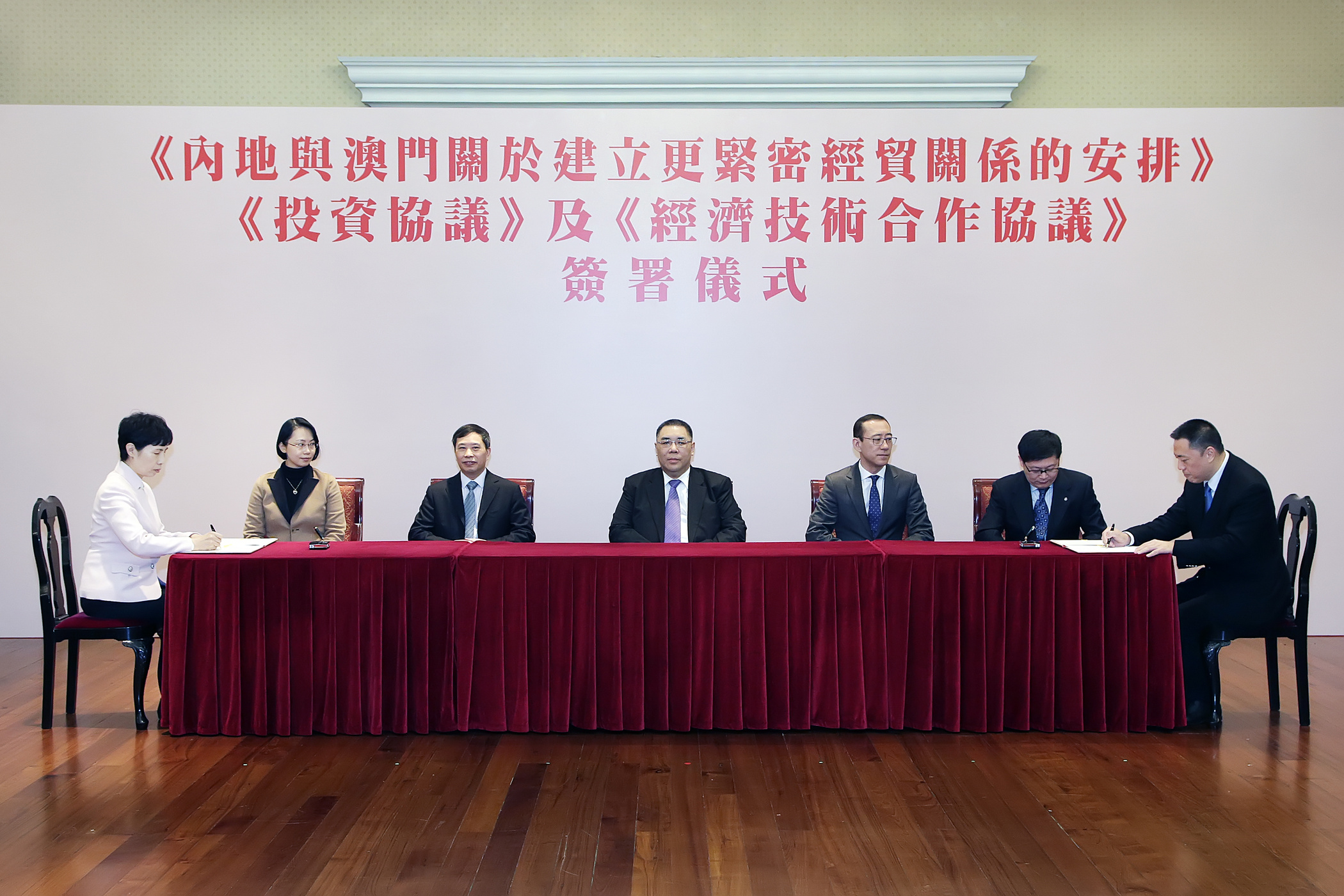 在澳門特別行政區行政長官崔世安、中央人民政府駐澳門聯絡辦公室副主任陳斯喜、國家商務部台港澳司司長孫彤、行政長官辦公室主任柯嵐、國務院港澳事務辦公室交流司副司長陳威見證下,高燕和梁維特分別代表國家商務部和澳門特別行政區政府簽署了兩份協議。