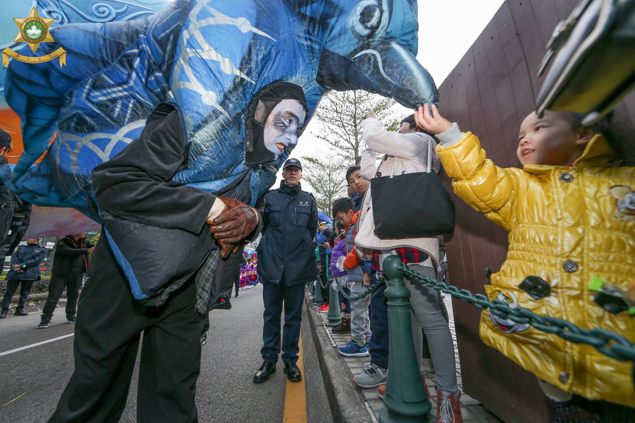 雖然澳門國際幻彩大巡遊舉行當天氣温顯著下降,但現場氣氛毫不退減,表演者與圍觀的市民和旅客均熱情互動、投入大巡遊活動之中。當大家欣賞各位表現者華麗服飾、精湛表演及生動木偶時,治安警察局人員亦堅守崗位,在巡遊路線增派人員維持秩序及疏導交通,確保大家能在安全及有序的情況下盡情享受精彩耀目的表演,渡過一個愉快的假日。