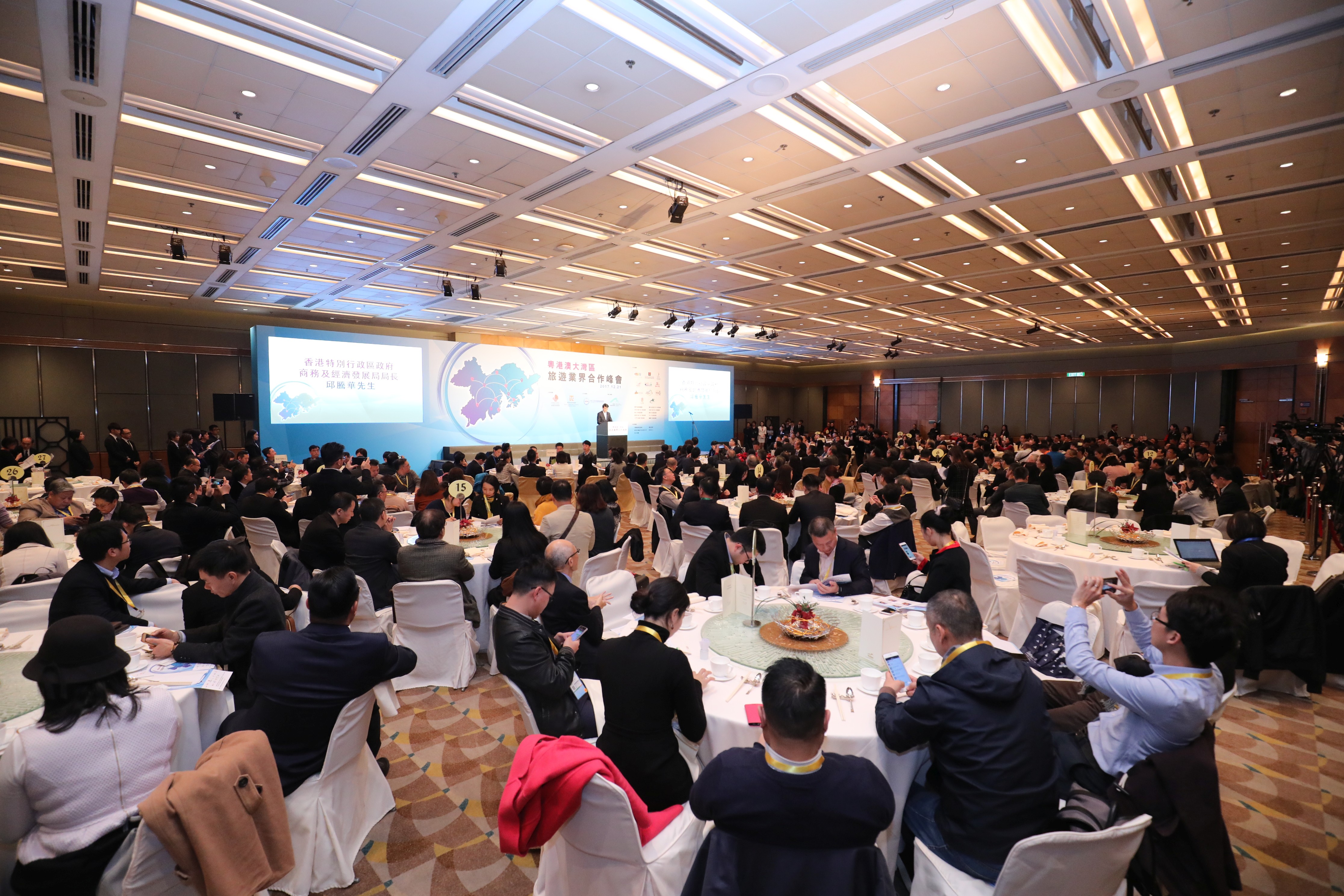 粵港澳大灣區旅遊業界合作峰會(簡稱:峰會)在香港會議展覽中心舉行,峰會活動包括旅遊業界業務洽談會、《粵港澳大灣區旅遊業界合作協議書》簽訂儀式、粵港澳大灣區主題演講及午宴以及會見媒體環節。參與是次峰會的嘉賓及粵港澳大灣區旅遊業界代表等約300人。