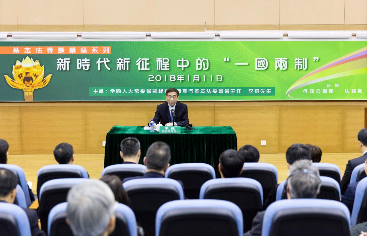 為積極推動公務人員對基本法的了解,法務局聯同行政公職局合辦專題講座,邀請全國人大常委會副秘書長兼澳門基本法委員會主任李飛先生主講,講座主題為「新時代新征程中的“一國兩制"」。通過講座為公務人員分析有關問題的核心內容,提升他們對基本法與“一國兩制"的全面準確掌握。