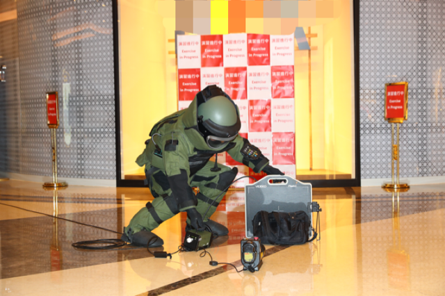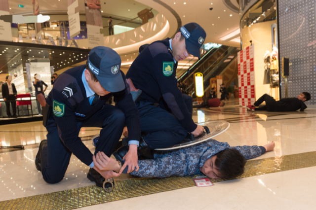 演練模擬路氹城區一酒店公共區域內發生一宗持械行劫案,四名劫匪持刀行劫一名途人後逃入旅客眾多的酒店大堂,其中兩名匪徒被酒店保安員攔截後突然發難刺傷兩名途人,並揚言持有爆炸品,引起場面混亂,導致多名旅客跌傷。