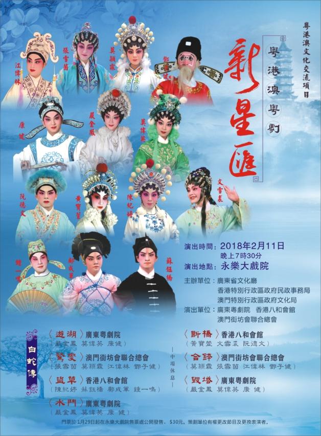 二零一八年度粵港澳文化合作項目 “粤港澳粤劇新星匯”,將由粵港澳三地青年粵劇新秀攜手合作,共同演繹長劇《白蛇傳》,於一月至二月期間分別在廣州、香港和澳門三地巡演。澳門場次演出將於二月十一日晚上七時三十分假永樂大戲院公演,歡迎市民購票欣賞。