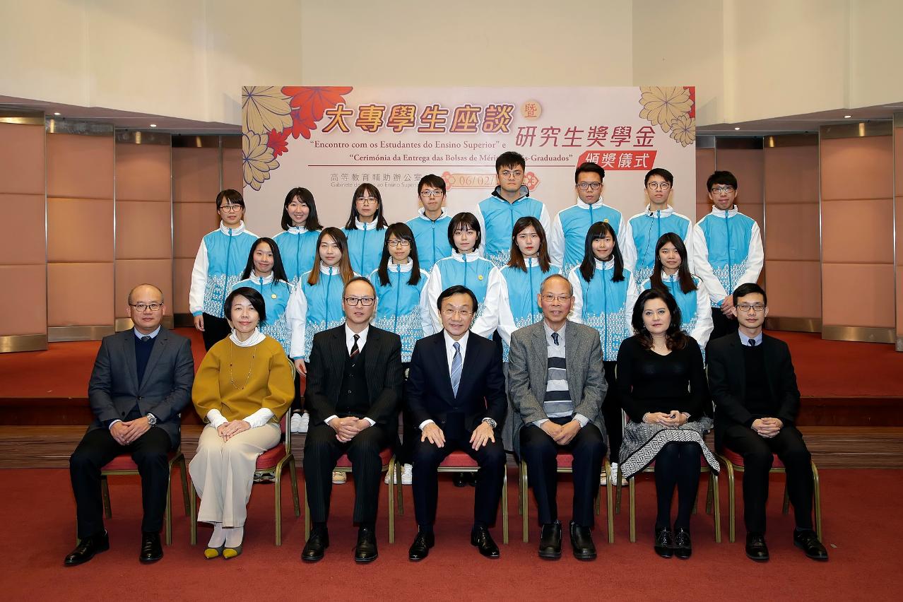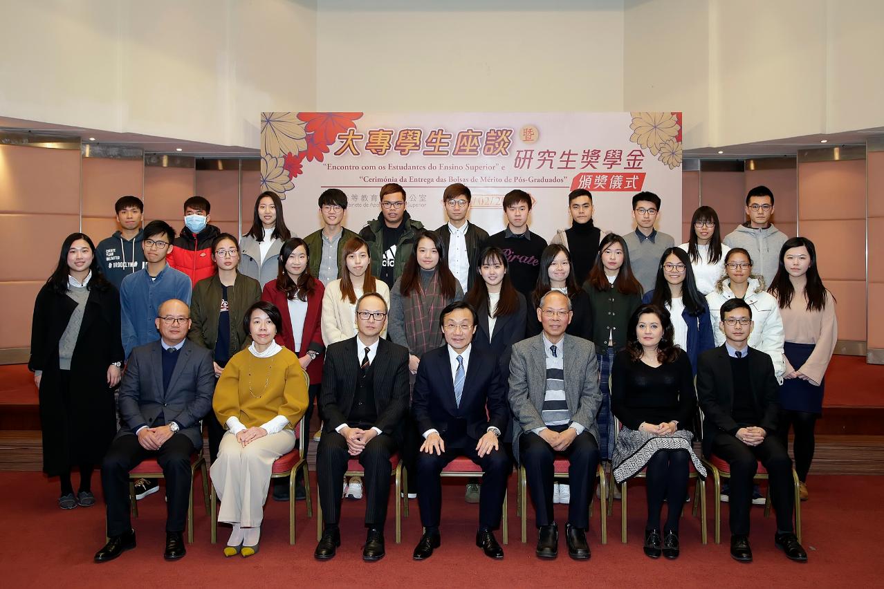 座談會後,研究生資助發放技術委員會舉行研究生獎學金頒獎儀式,2017/2018學年研究生奬學金獲獎者共有127人,其中博士20人,碩博連讀的博士5人,碩士100人,學碩連讀的碩士2人。此外,還有1名獲獎者獲得社會工作局發放社會工作專業範疇的碩士獎學金,以及2名赴葡萄牙科英布拉大學升學的學生獲得人才發展委員會發放碩士奬學金。出席的獲獎者獲譚俊榮司長、高教辦蘇朝暉主任、研究生資助發放技術委員會李沛霖委員、何麗鑽委員、何絲雅委員及高教辦曾冠雄副主任頒發證書。