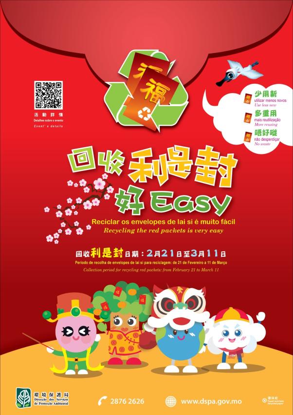 為貫徹資源回收、循環再用的環保政策,環境保護局今年繼續於新春期間推出“回收利是封好EASY "活動,活動共得到約150個機構支持,超過600個回收點,方便市民參與回收,共渡綠色新年。